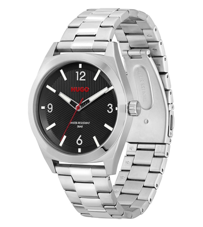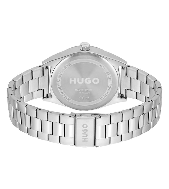 This Hugo watch make family has a stainless steel case 42 mm in diameter and is fitted with a metal bracelet. The watch case contains a movement and a mineral crystal. The watch is 3 atm water resistant. This means the watch is splash proof. The watch comes with a 2 year worldwide warranty.