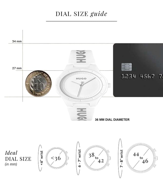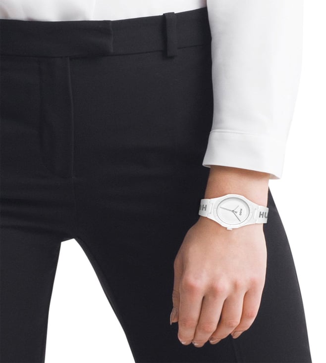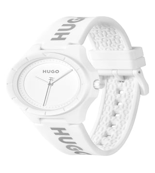 Amaze everyone around you by wearing this women's analog watch from the collection by HUGO. The white round dial is protected by a scratch resistant glass. It features a crown for time adjustwoment. The silicon strap comes in a white hue that further elevates the look of the timekeeper. Besides, it is completed with a buckle clasp to ensure a secure fit on the wrist.
