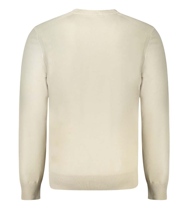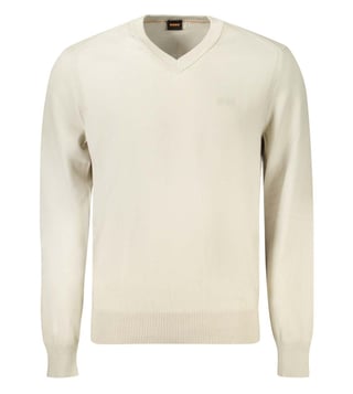 Adorn the modern look with this beige v-neck logo sweatshirt from Hugo Boss crafted in cotton/kapok featuring v-neck, long sleeves, logo detailed, ribbed cuffs and hem, pullover.