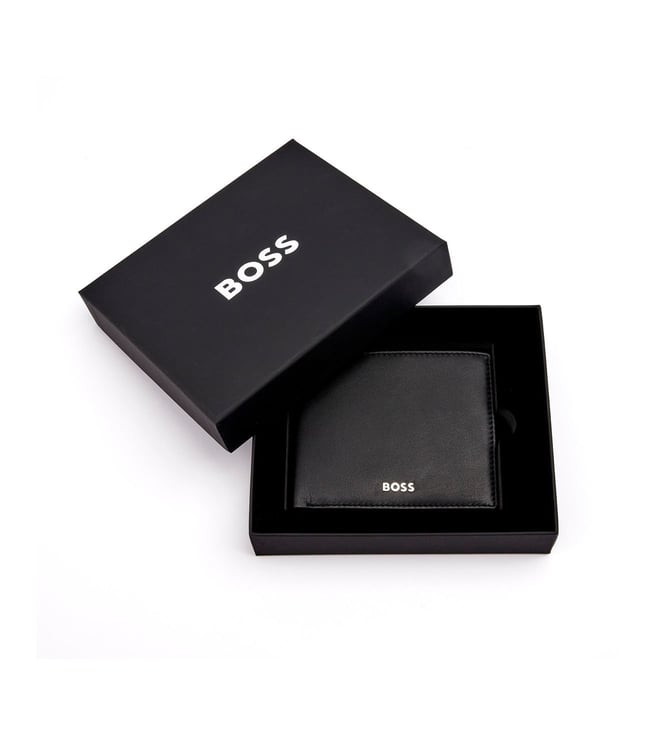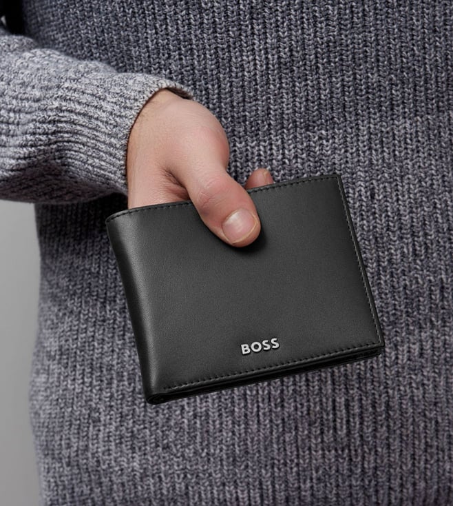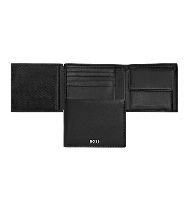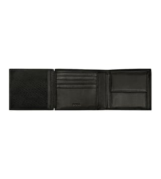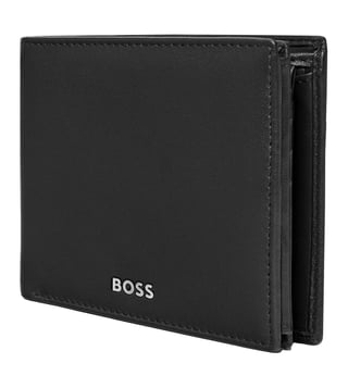 This trifold wallet with a coin pouch is made of carefully chosen, top-grain black smooth leather. It is adorned with a luxurious chrome BOSS signature plate and features monogrammed inside lining. The wallet includes: 2 currency compartments 8 card slots 3 side compartments 1 coin slot In line with the BOSS brand DNA, it is simple, functional, elegant, and minimal.