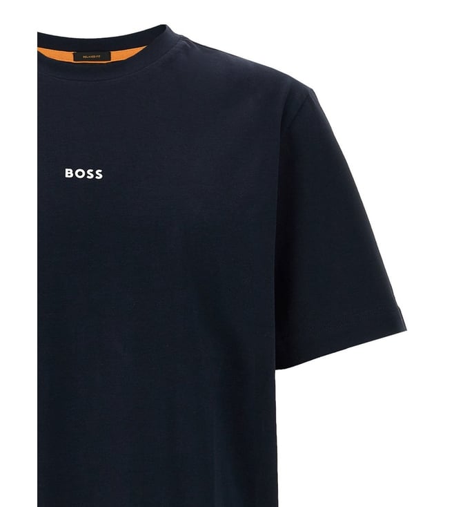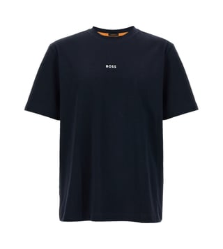 Elevate your style with the Hugo Boss Navy Logo Relaxed Fit t-shirt. Tchup' stretch cotton t-shirt with front embossed logo print, crew neck, short sleeves. Relaxed fit.