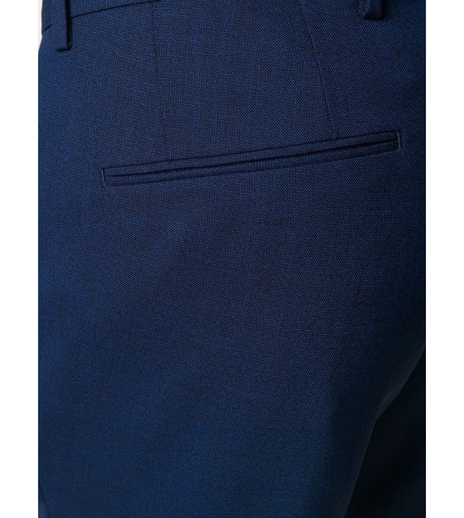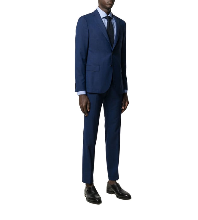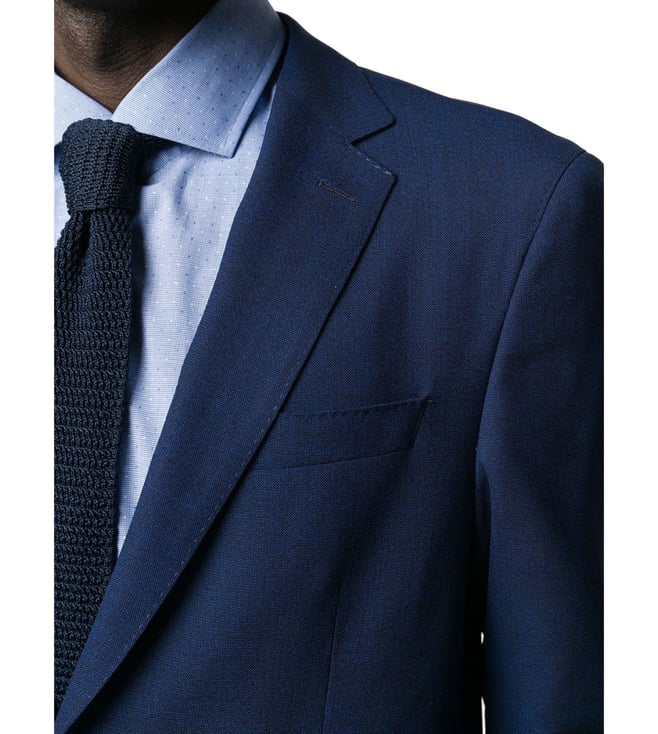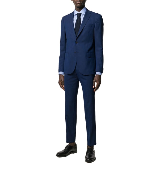 Elevate your style with the Hugo Boss Blue Regular Fit Single Breasted Suit. Twopiece men's suit in wool in blue by boss. Jacket with classic lapels, singlebreasted front closure, long sleeves, buttoned cuffs, front flap pockets, chest pocket and straight hem. Classic trousers with waist featuring belt loops, regular length. Products purchased from Darveys are supported exclusively by the warranty/exchange policies of Darveys and its partner boutiques. Brand owners and their channel partners are not responsible for exchange/warranty services for items purchased through Darveys.