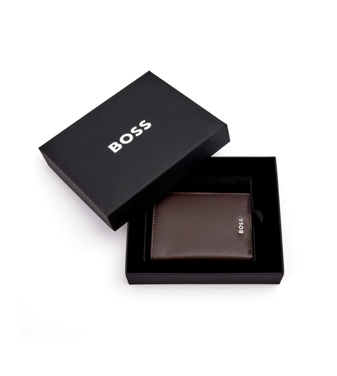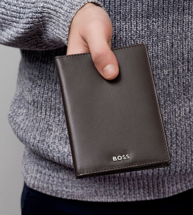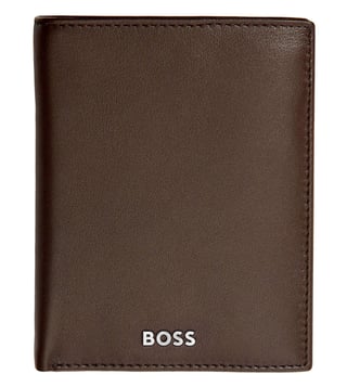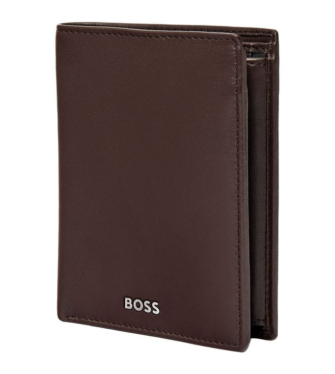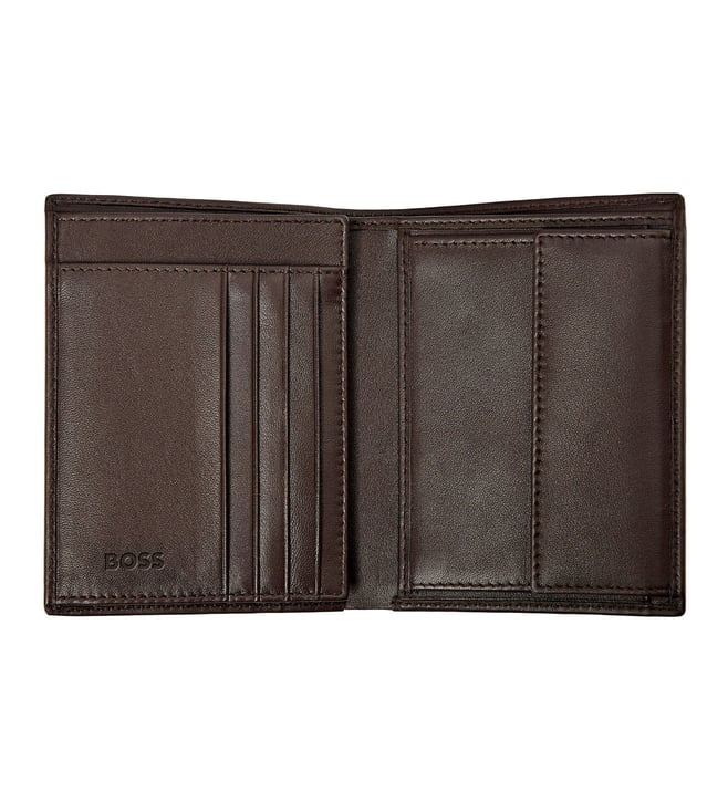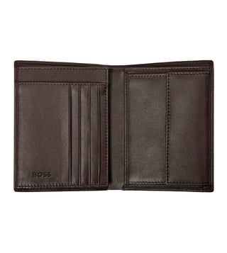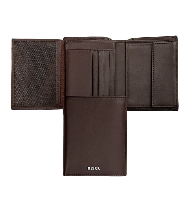 This vertical wallet with flap and a coin pouch is made of carefully chosen, top-grain brown smooth leather. It is adorned with a luxurious chrome BOSS signature plate and features monogrammed inside lining. The wallet includes: 2 currency compartments 8 card slots 5 side compartments 1 coin slot In line with the BOSS brand DNA, it is simple, functional, elegant, and minimal.
