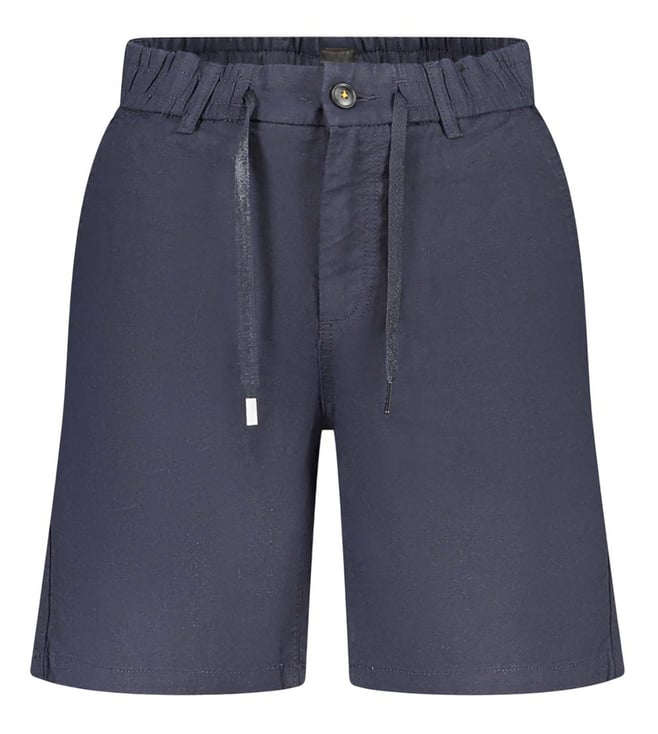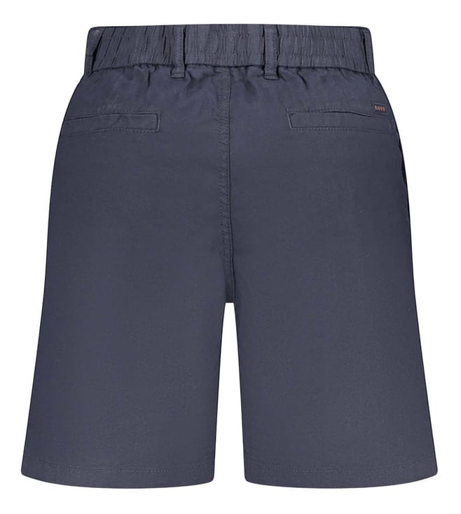 Adorn the modern look with this navy blue logo bermuda shorts from Hugo Boss crafted in polyester/linen featuring tapered fit, five pockets, attached drawstring wasitband, button closure, belt loops, logo detailed. Products purchased from Darveys are supported exclusively by the warranty/exchange policies of Darveys and its partner boutiques. Brand owners and their channel partners are not responsible for exchange/warranty services for items purchased through Darveys.