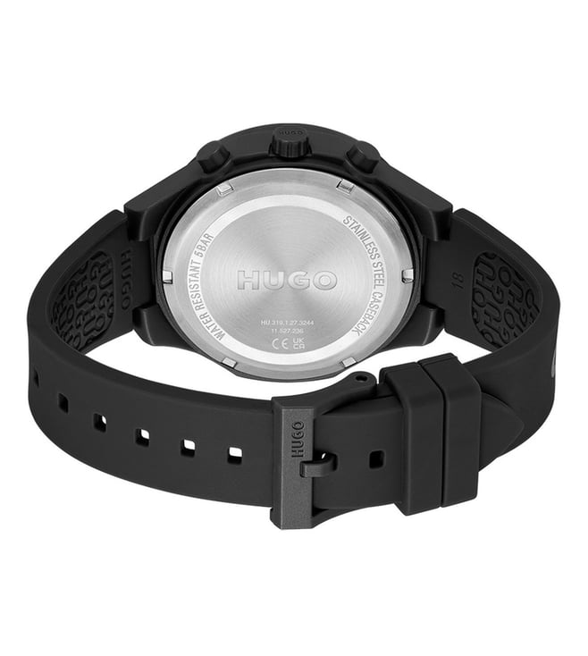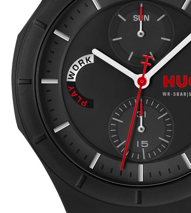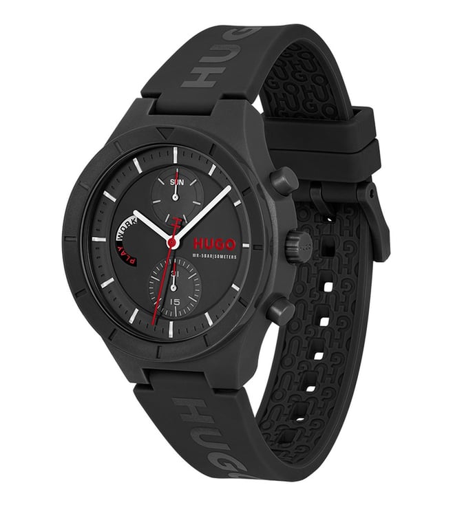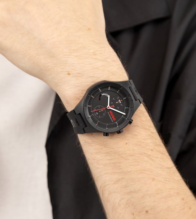 Add a classy touch to your attire by wearing this men's analog watch from the collection by HUGO. The black round dial is protected by a mineral glass. It features crown for time adjustment. The silicon strap flaunts a black hue that accentuates the look of the watch. Besides, it is completed with a pin buckle clasp to ensure a secure fit on the wrist.