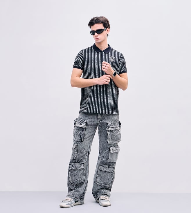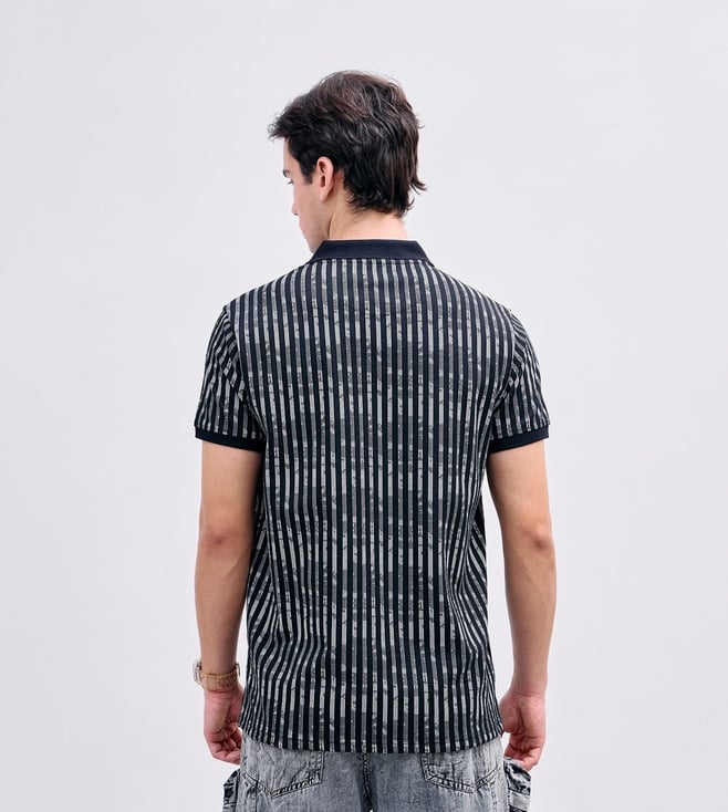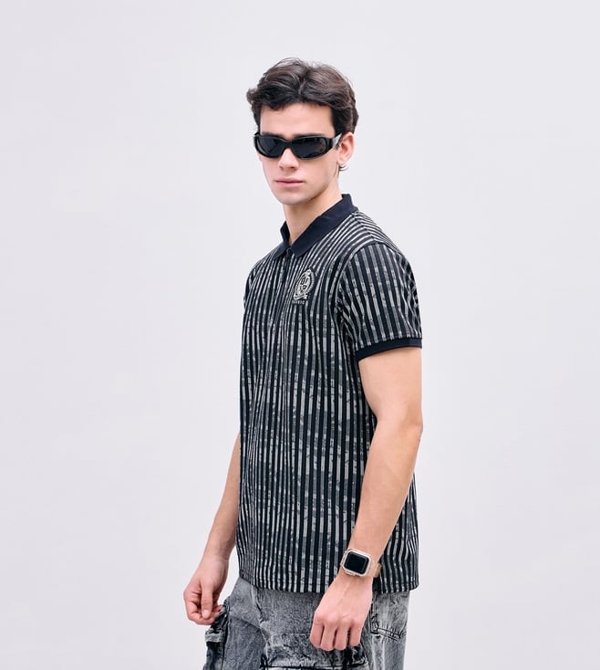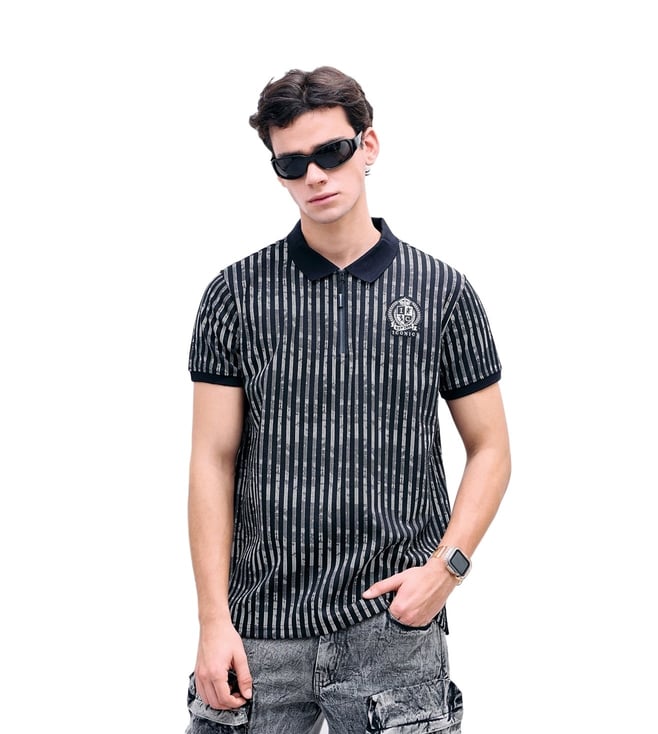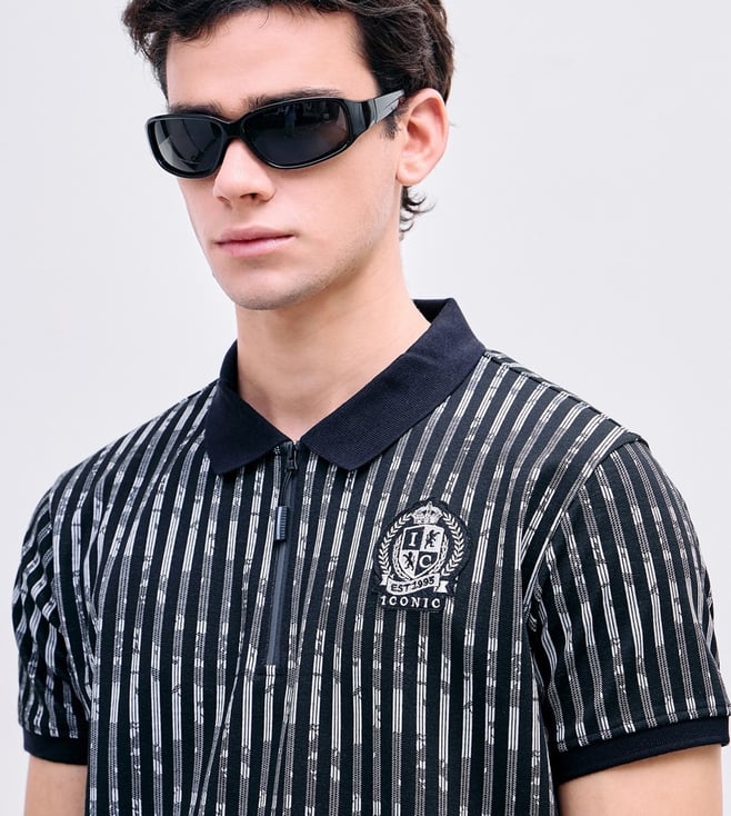 Iconic Black Regular fit Stripes Polo T-Shirt