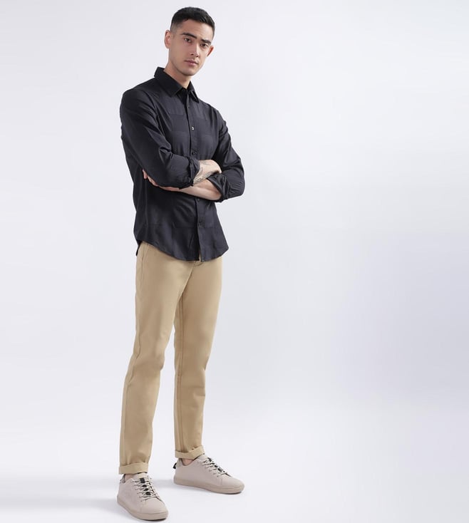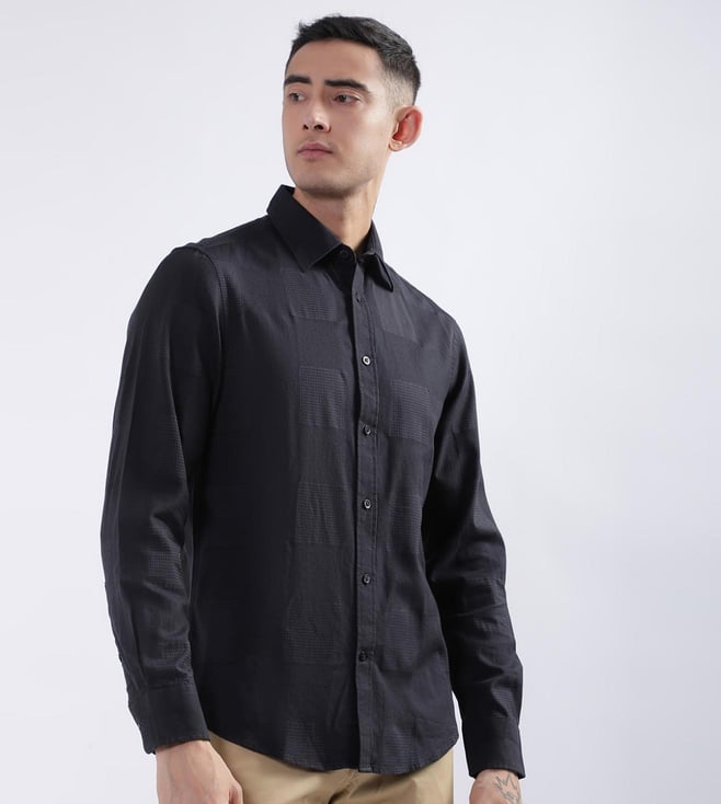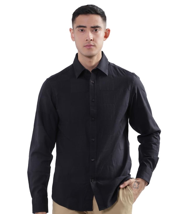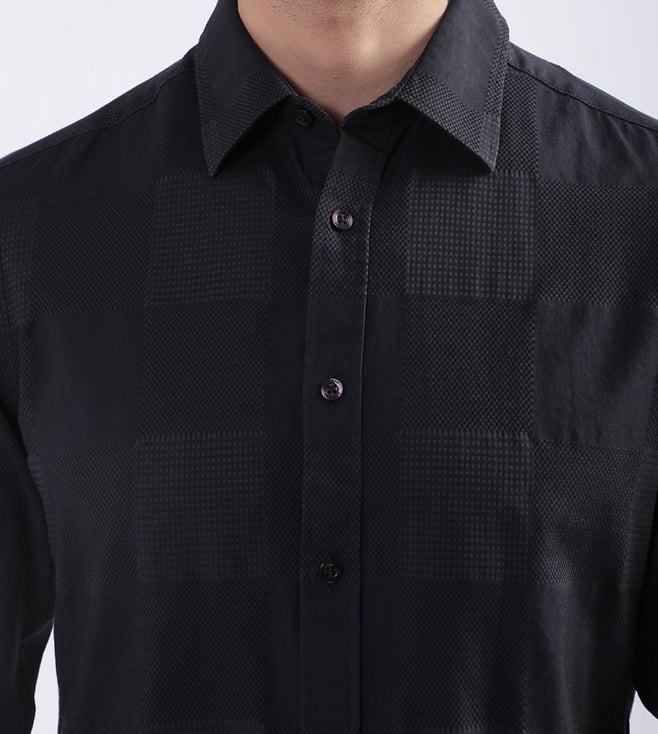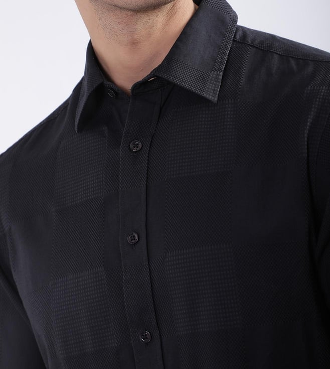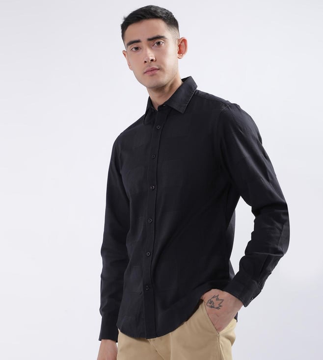 Elevate your wardrobe with our sleek black slim-fit shirt, designed for the modern man who values style and comfort. Crafted from pure cotton, this shirt offers a luxurious feel and breathability, perfect for any occasion. The textured pattern adds a subtle sophistication, while the full sleeves and spread collar provide a classic touch. Featuring a button closure for a polished finish, this shirt effortlessly transitions from office to evening. Embrace timeless elegance with this versatile wardrobe essential.