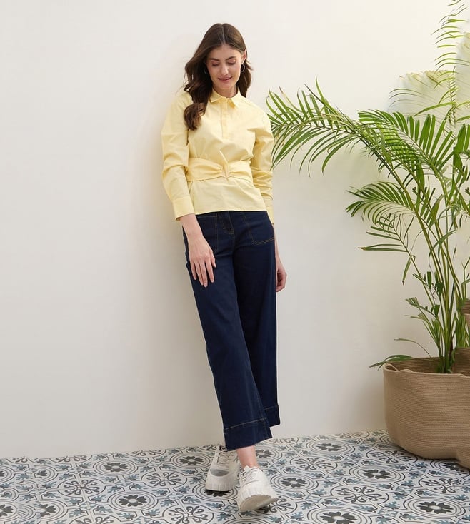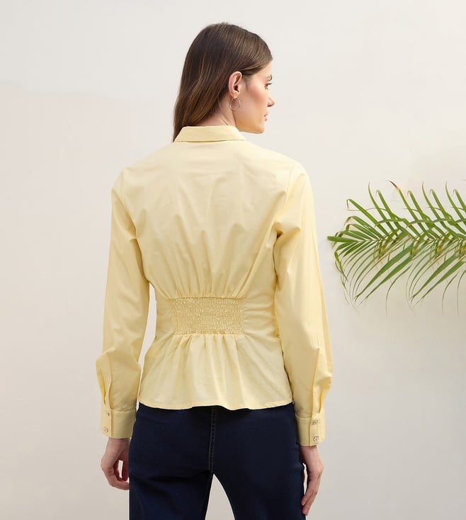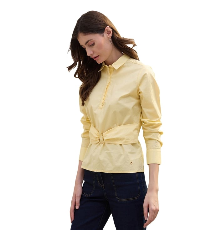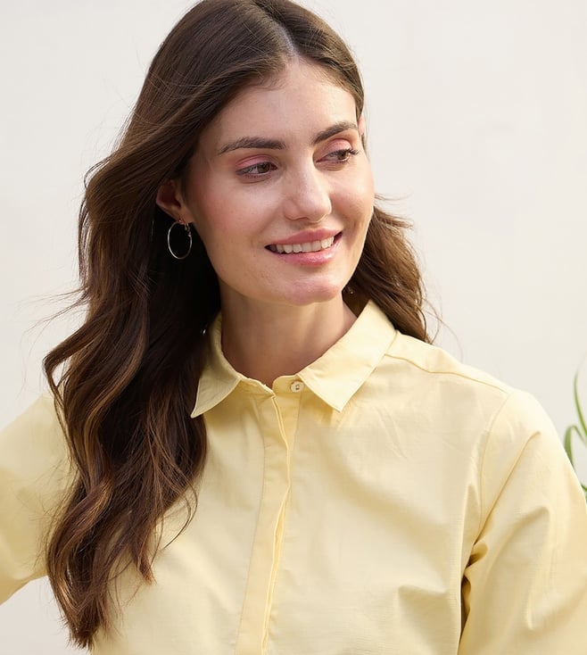 Embrace timeless elegance with this stunning yellow top, crafted from 100% premium cotton for ultimate comfort and breathability. Its vibrant hue radiates warmth, while the solid pattern offers a versatile canvas for any ensemble. Designed with a regular fit, it gracefully contours to your silhouette, ensuring both style and ease. The classic shirt collar and long sleeves add a touch of sophistication, making it perfect for both casual outings and more formal occasions. Elevate your wardrobe with this chic essential.