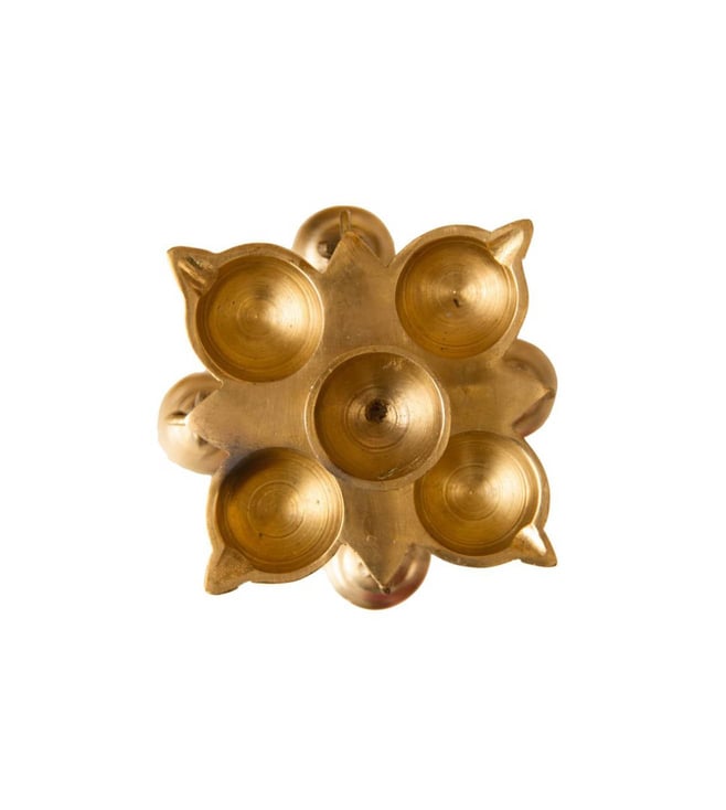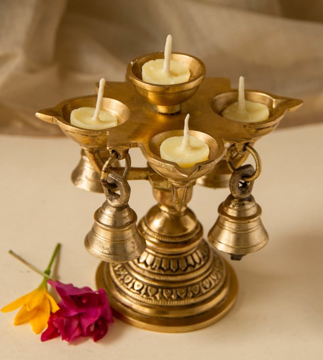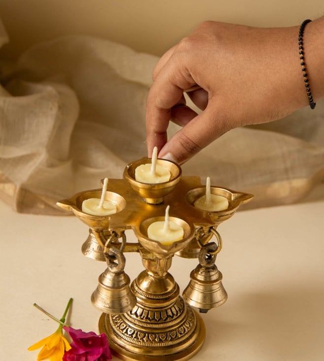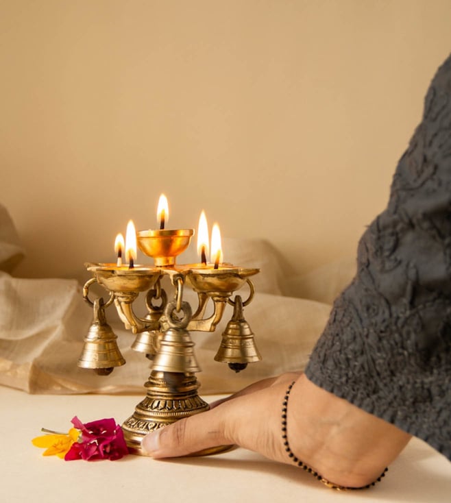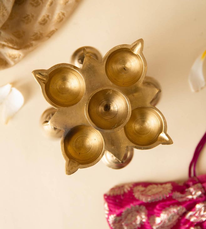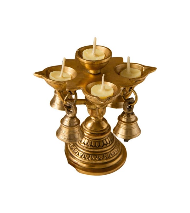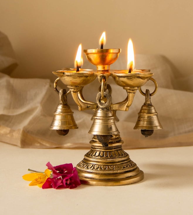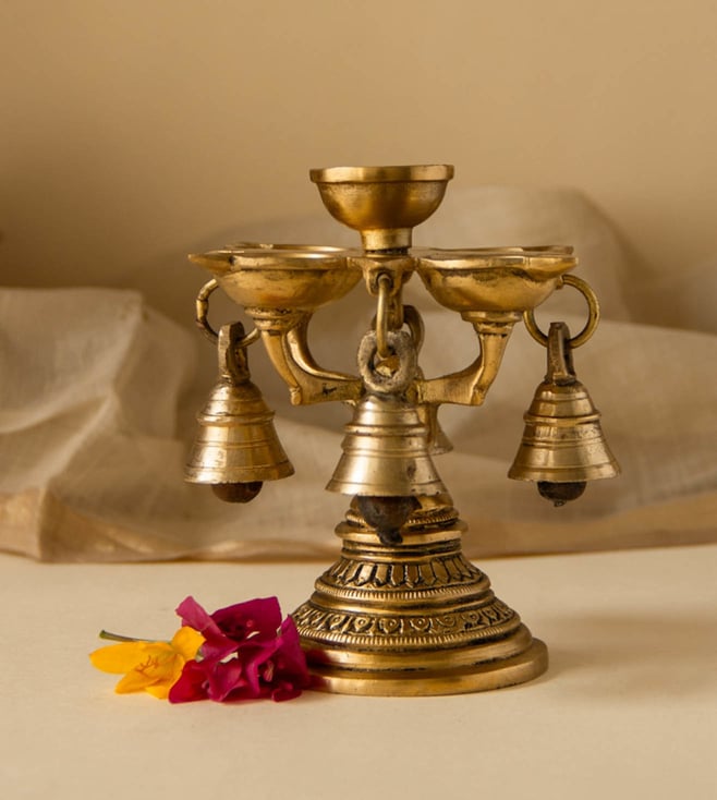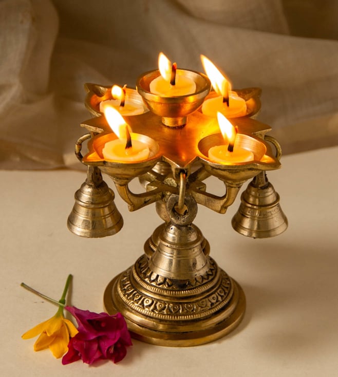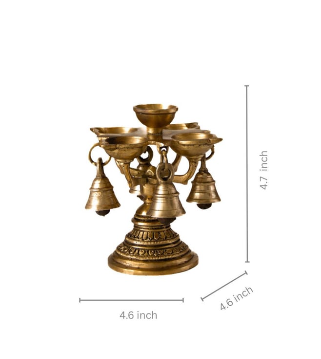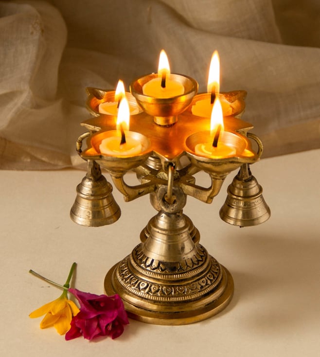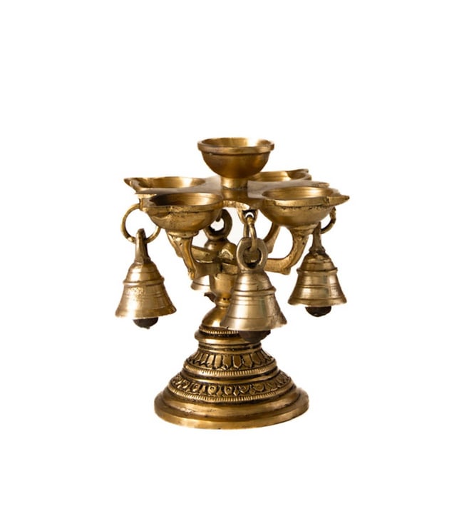 IMLI STREET Brass 5 Diya Aarti Stand With Bells