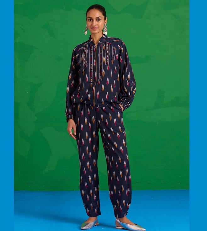 Liaison Blue Palazzo with Pin Tucks and Embroidery At Hemline