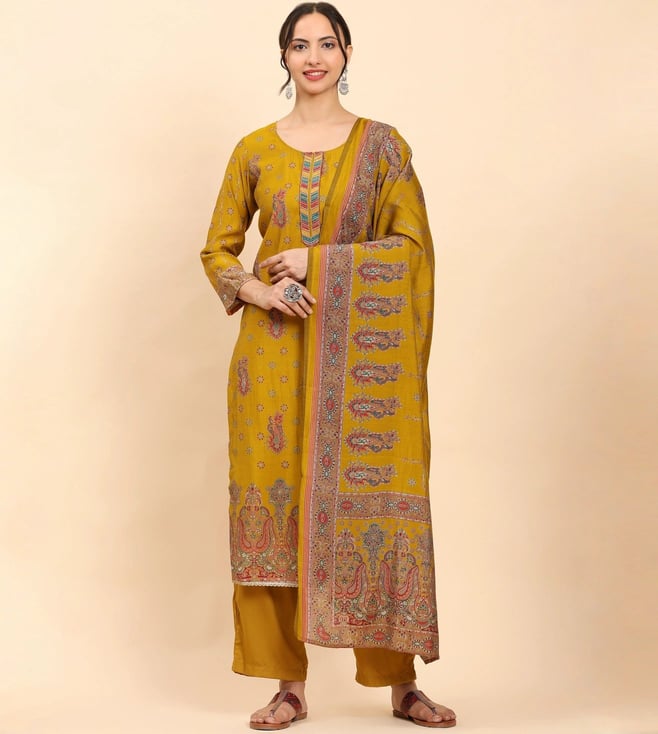 Mustard Jugni Collection Sunspill Handprinted Mashru Silk Kurta Set With Pant