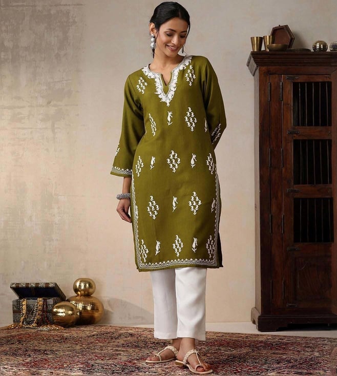 Olive HOC Crafts Aari Embroidered Woollen Solid Women's Long Kurta