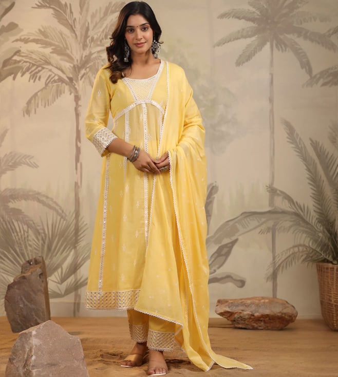 Yellow Mulmul Embroidered Anarkali Kurta And Pant With Dupatta