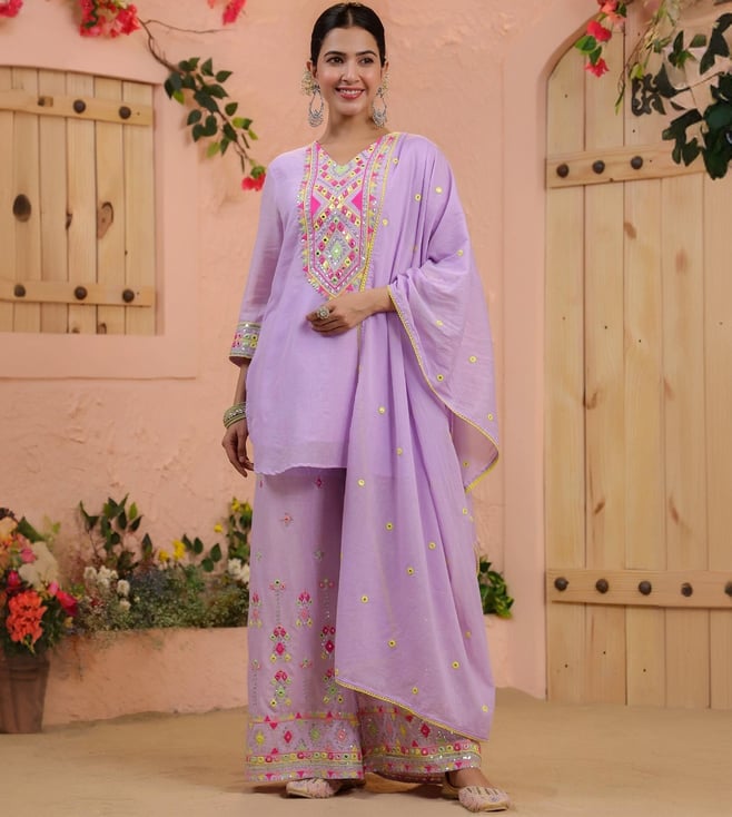 Lavender Mulmul Mirror & Sequin Embroidered Kurta with Palazzo and Dupatta