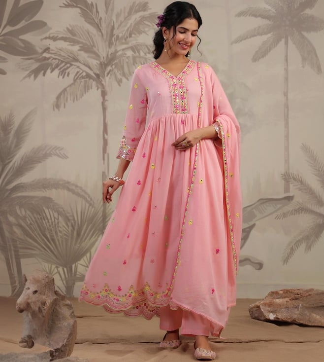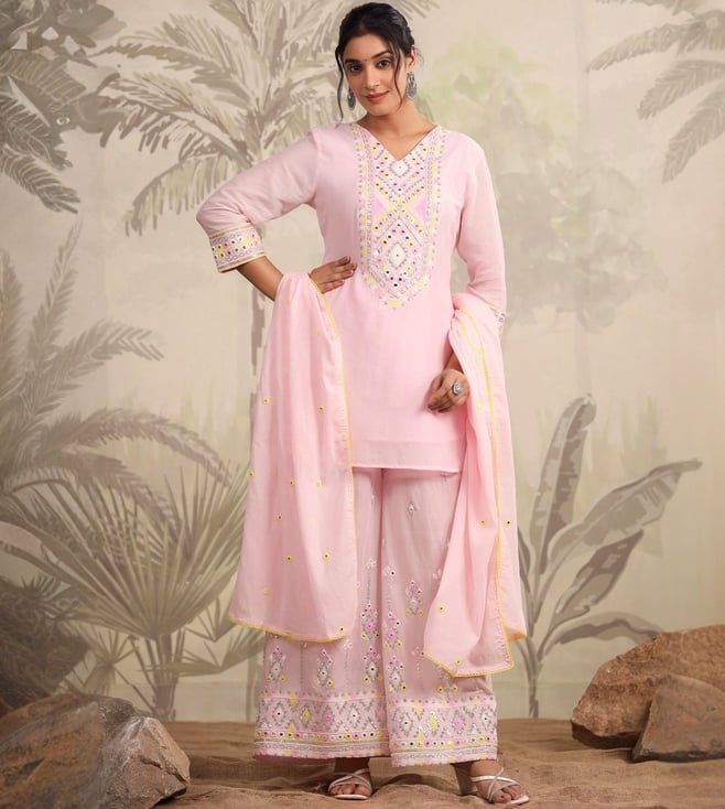 Pink Mulmul Mirror & Sequin Embroidered Kurta with Palazzo and Dupatta