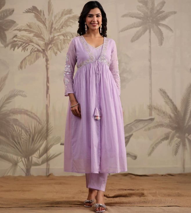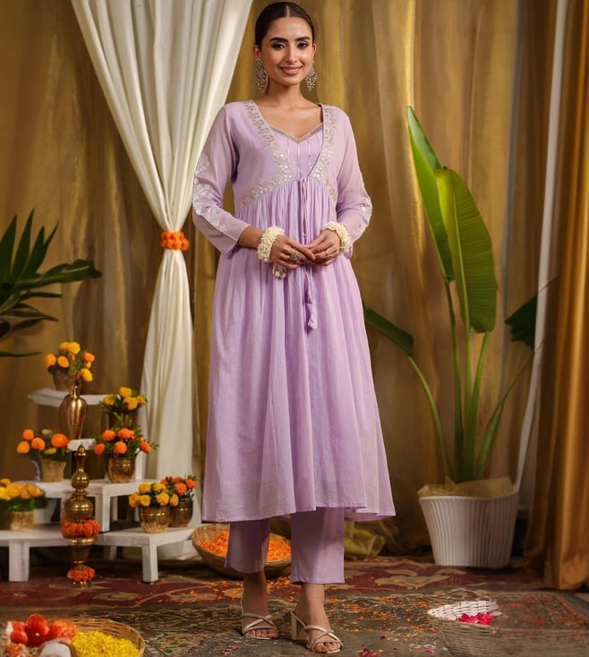 Lavender Mulmul Gota Work Kurta with Pant And Shrug