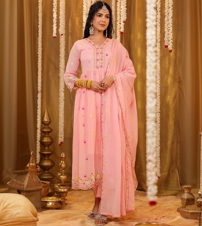 Peach Mulmul Multicoloured Mirror and Sequin Embroidered Anarkali with Pant and Dupatta