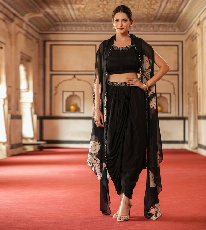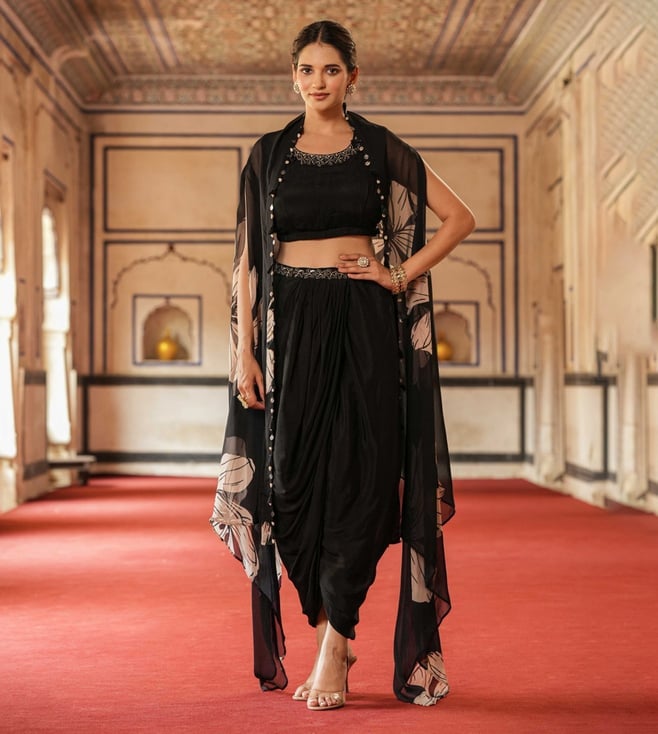 Black Chinon Silk Floral Print Drape Skirt with Choli and Cape