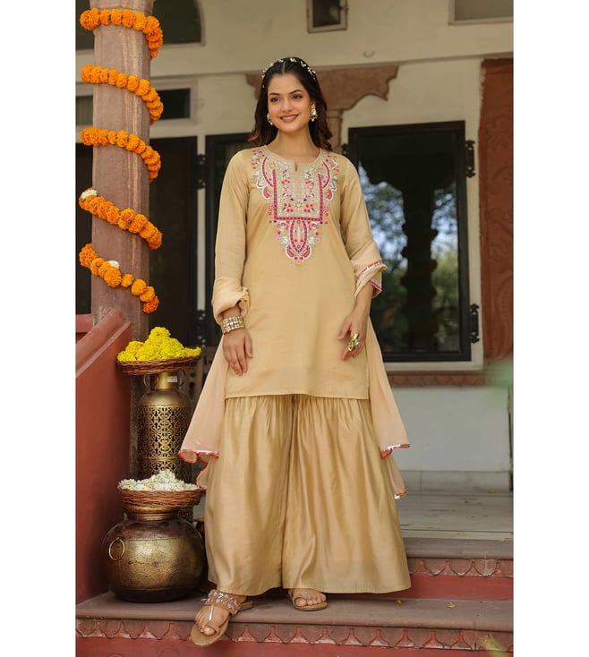 Yellow Cotton Multicolor Mirror & Sequin Embroidery Kurta with Sharara and Dupatta