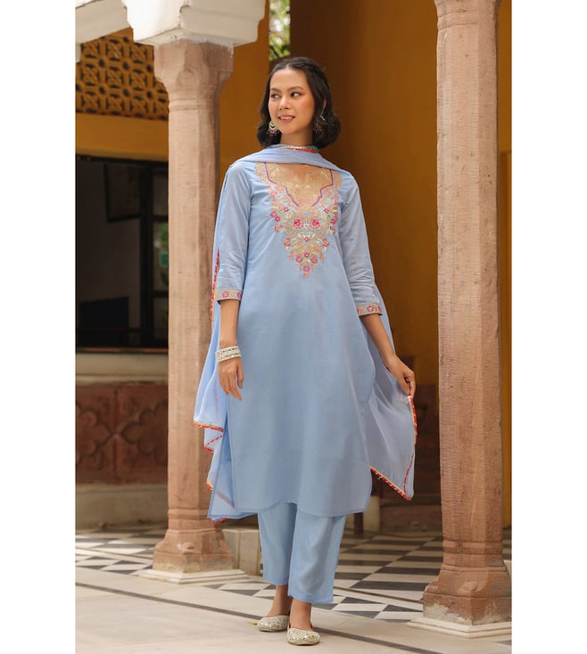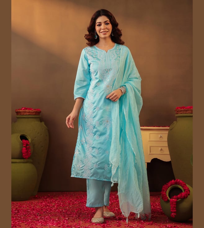 Blue Chanderi Silk Embroidered Straight Suit Set