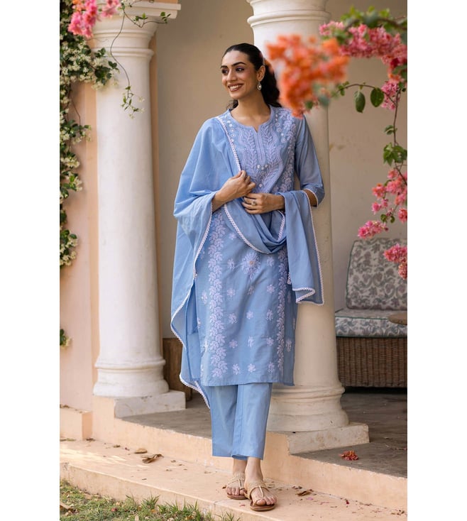 Powder blue Cotton Mulmul Chikankari Embroidered Straight Suit Set