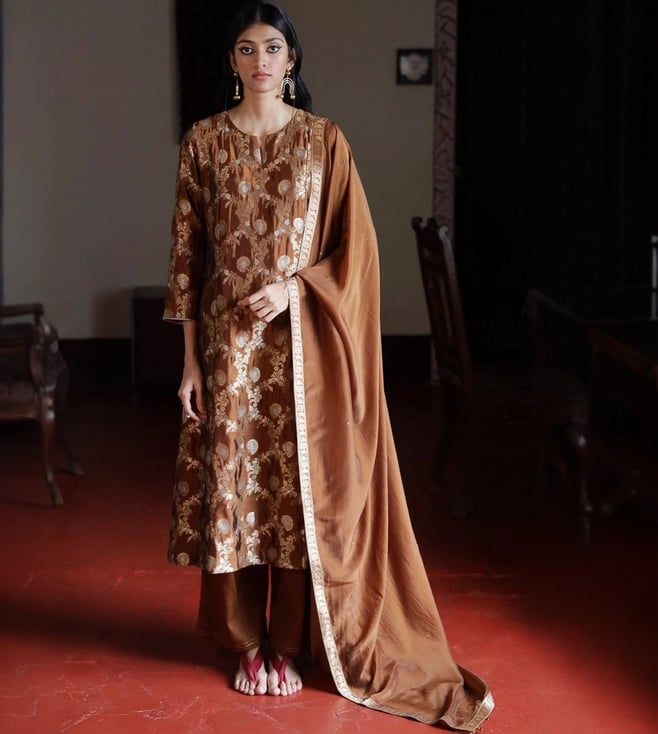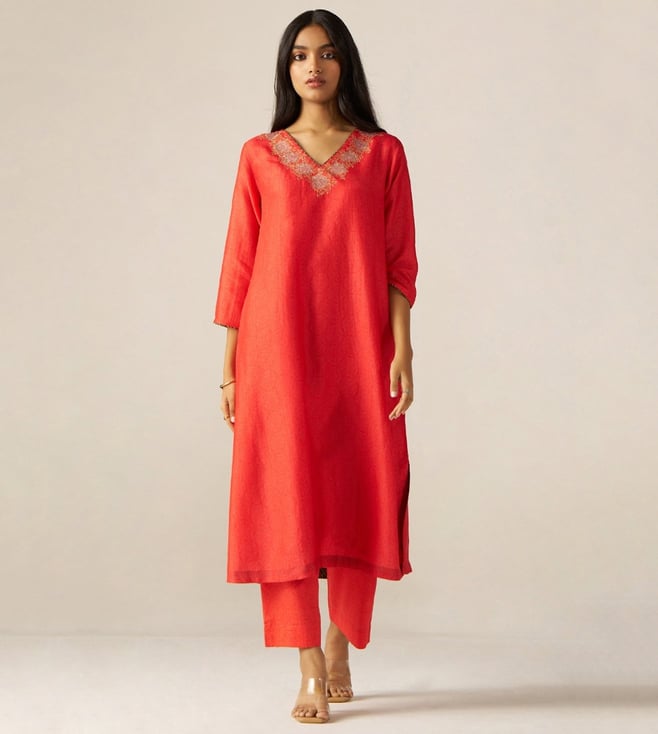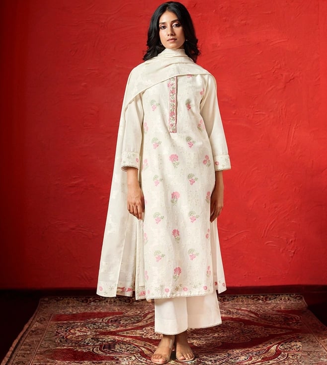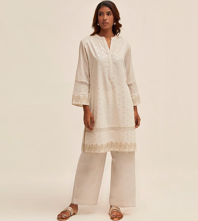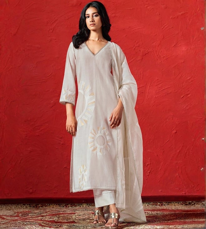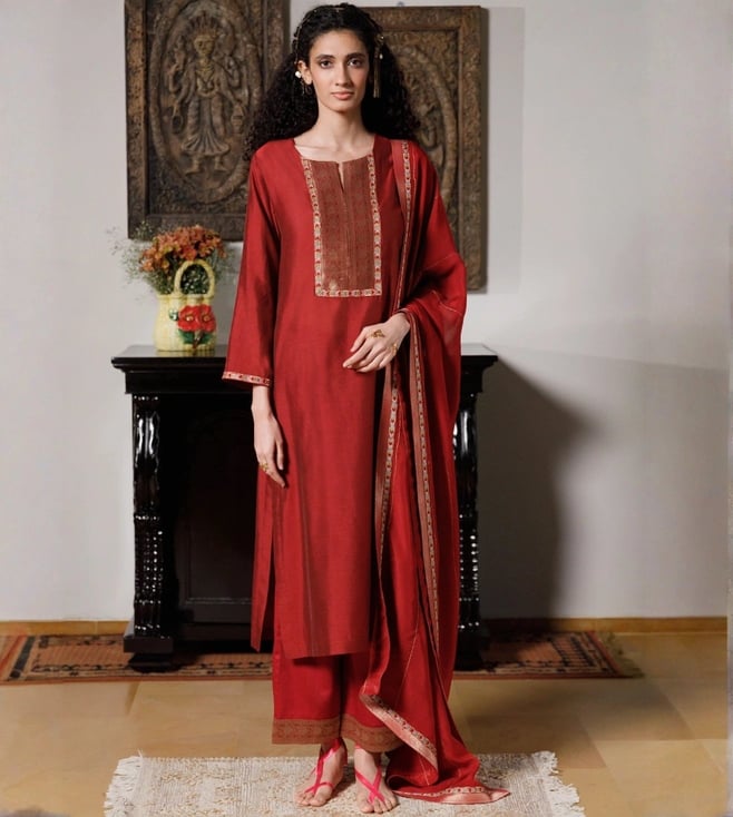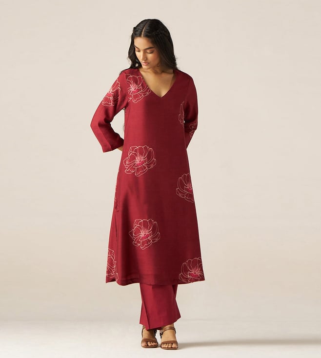 Ivory & Maroon Essence Chanderi Banjara Embroidery Kurta and Pant Co-ord Set