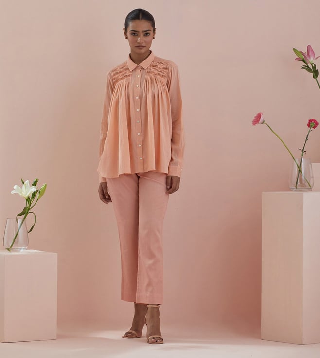 Peach Chaav Ethereal Cotton Embroidered Co-ord Set Top With Shrug With Pant