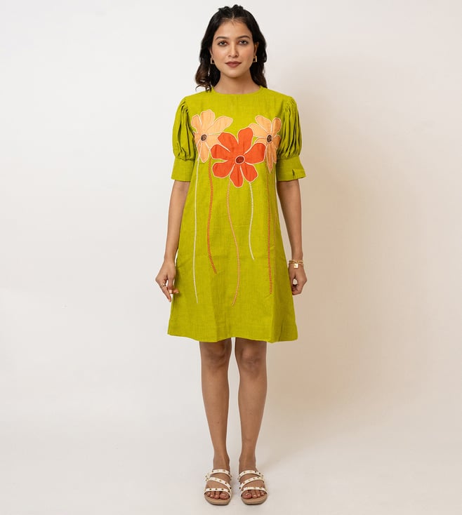 Women's Plumeria Green Handcrafted Cotton Dress