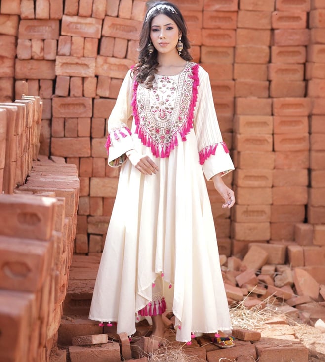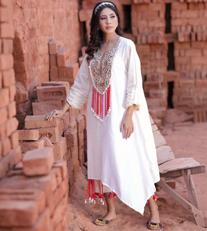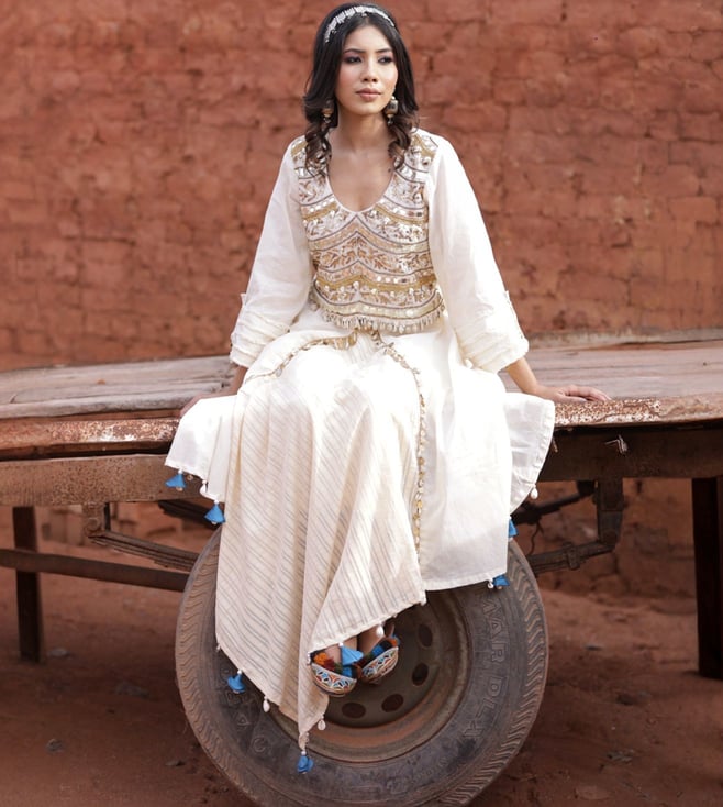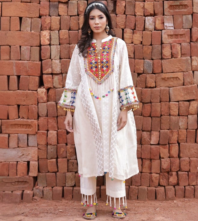 Yellow & Ivory Leher Kai Hand Embroidered Kurta with Pants and Dupatta