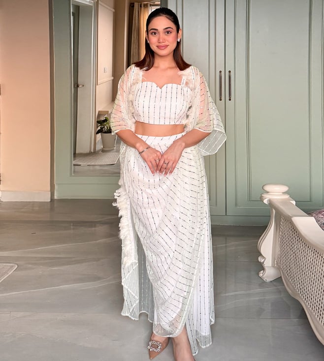 Off White Bird Georgette Crop Top and Draped Skirt Co-ord Set
