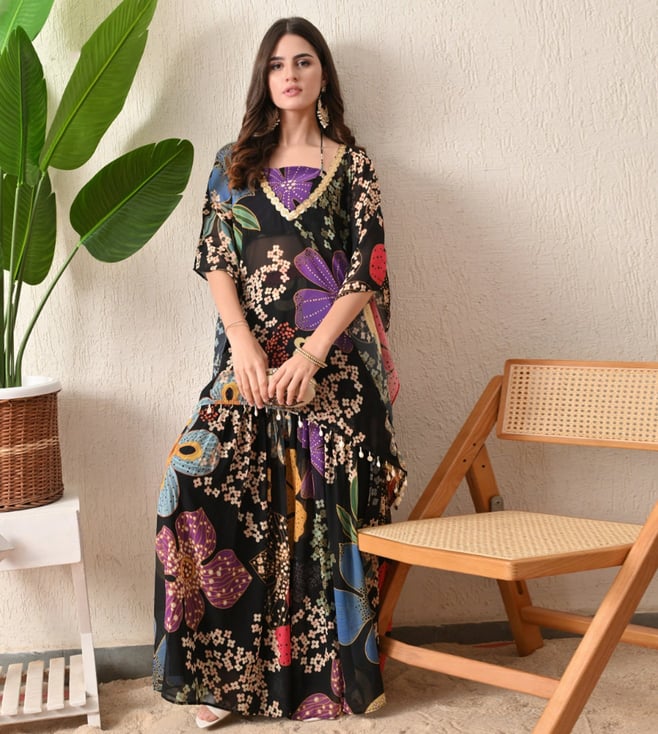 Navy Blue Floral Printed Georgette Cape Jacket with Crop-Top and Sharara