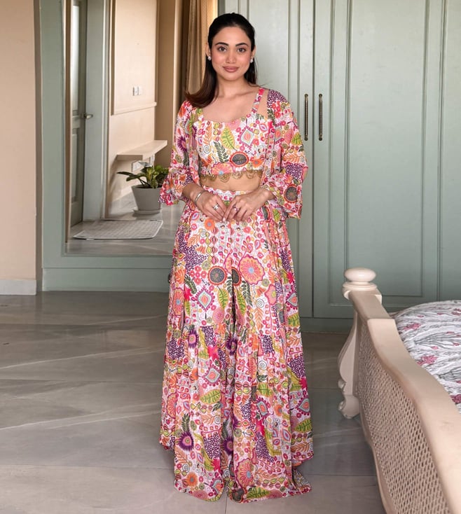 Off White Georgette Slim Fit Floral Crop Top and Sharara Set with Jacket