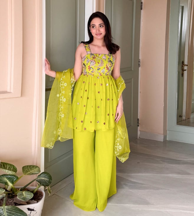 Parrot Green Georgette Slim Fit Embroidered Kurta and Sharara Set with Dupatta