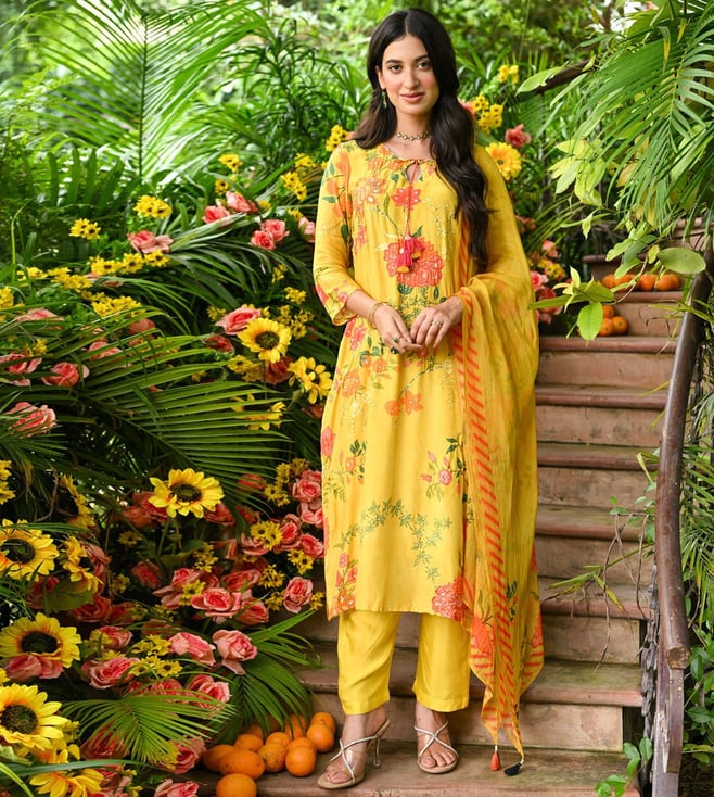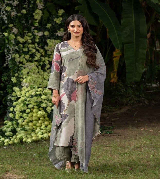 Rama Green Jashn Block Floral Print Chanderi Kurta with Pant and Dupatta