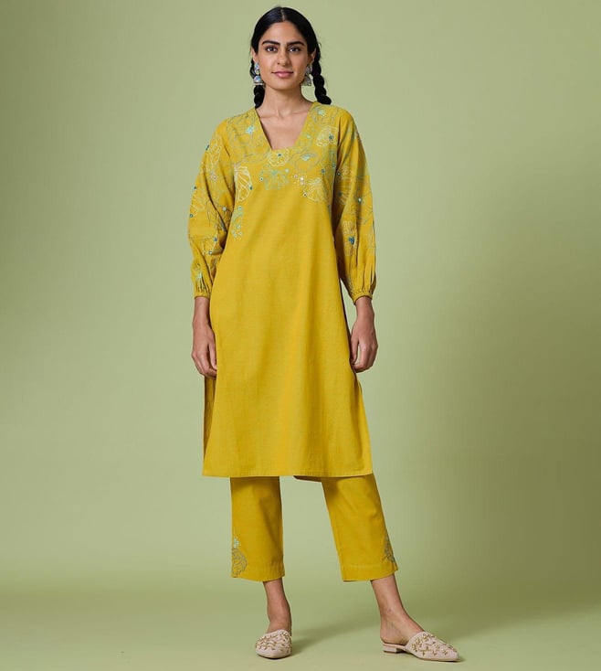 Yellow Daisy Pure Cotton Hand Embroidered Mirror Work Kurta with Pant