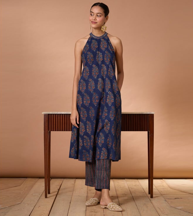 Aprajita Hand-Embroidered Mirrorwork Pure Cotton Indigo Kurta Pant Set