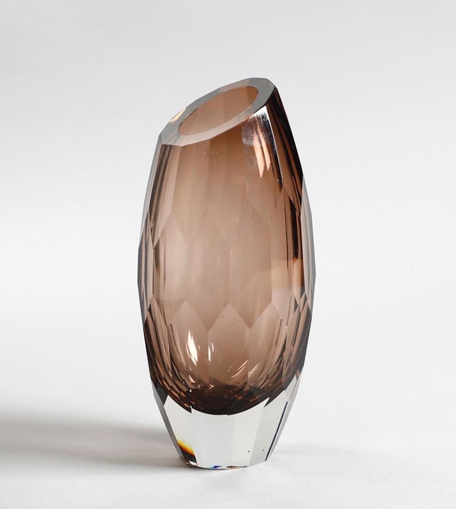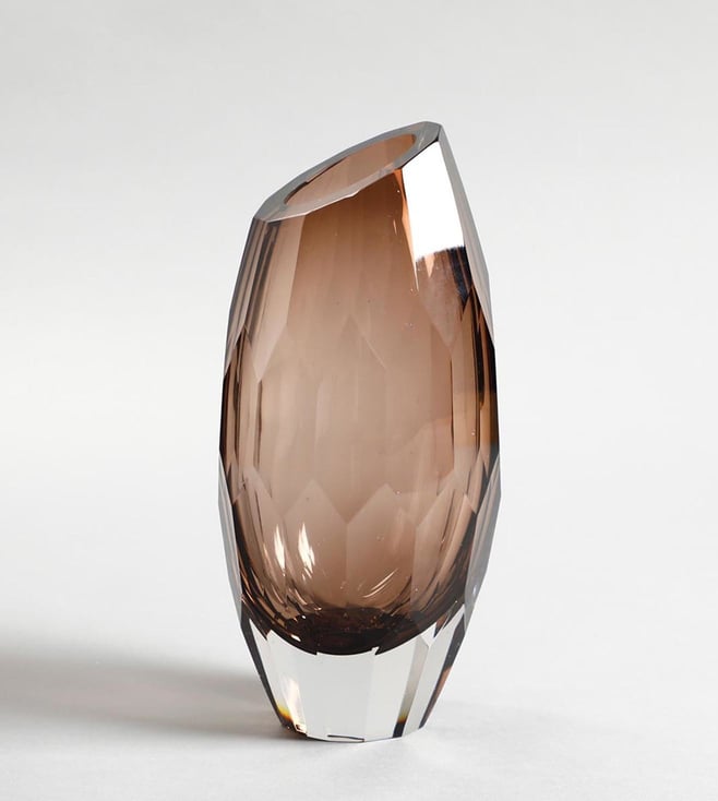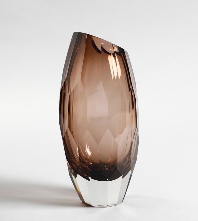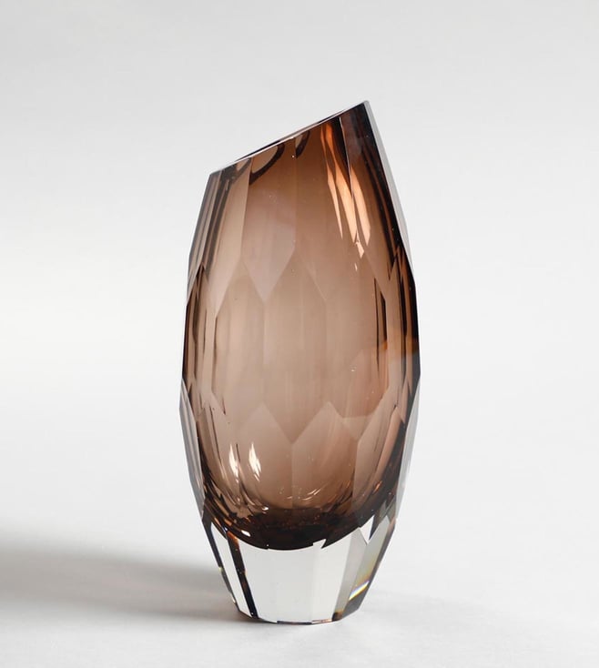 The geometrically champhered surface makes the language of Quartz Hand- Cut Crystal Vase, a statement piece to have, paralleled with utility of vase shaped with coloured crystal elevates the Interior space. The Crystal Vase is available in Chocolate Brown colours.