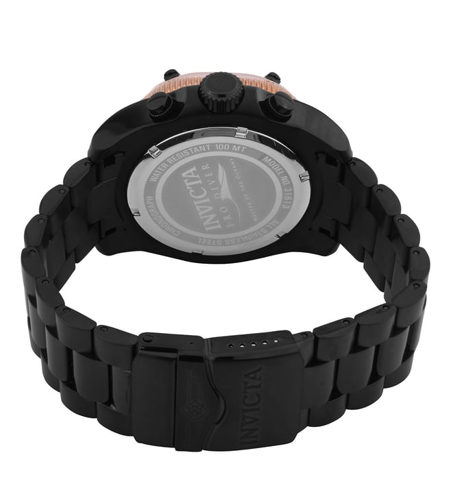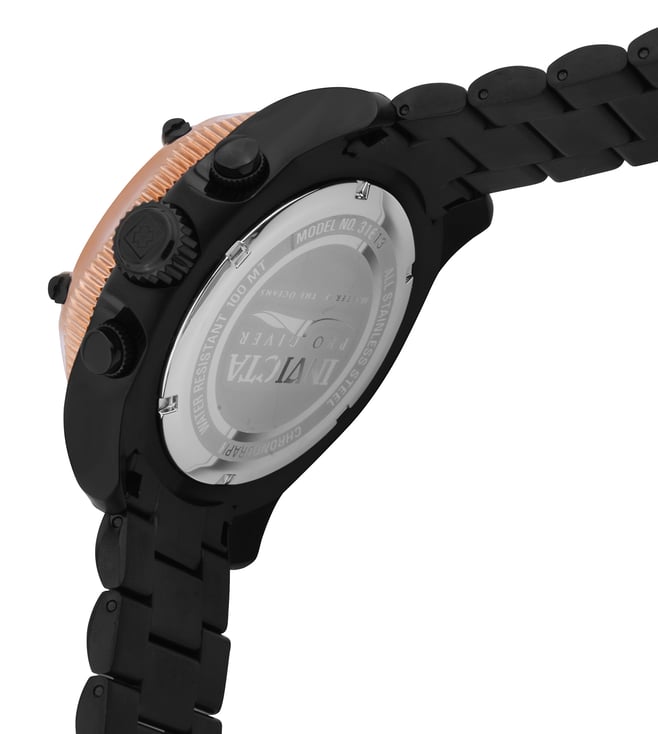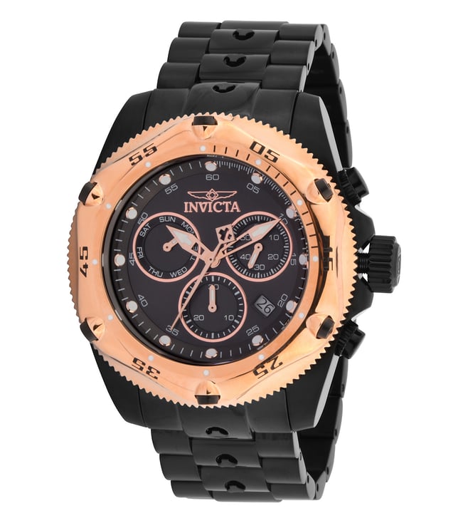 Carry great technology wrapped around your wrist with this stylish men's analog watch from INVICTA. The black round dial is protected by a mineral glass. Thestainless steel strap comes in a black hue that further elevates the look of the timekeeper. Besides, it is completed with a fold-over clasp with safety clasp to ensure a secure fit on the wrist.