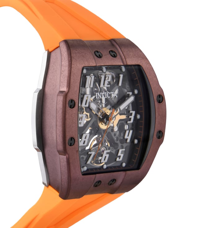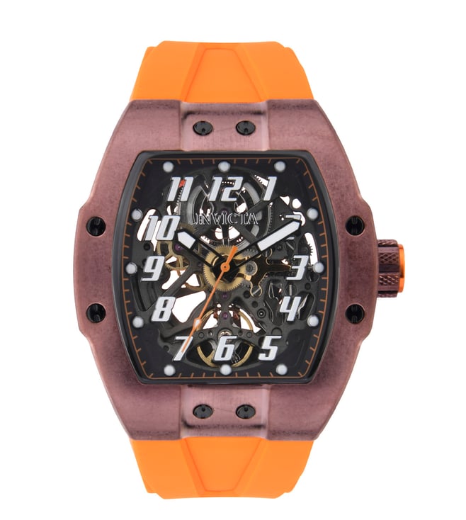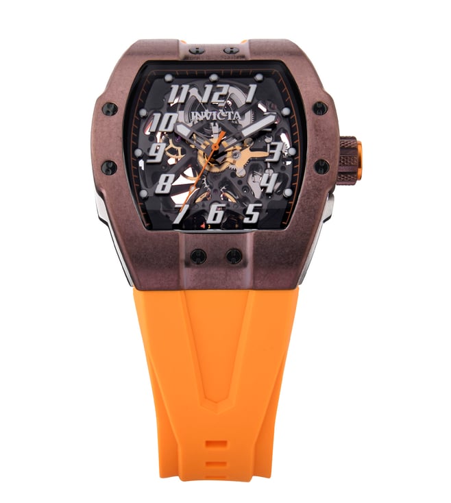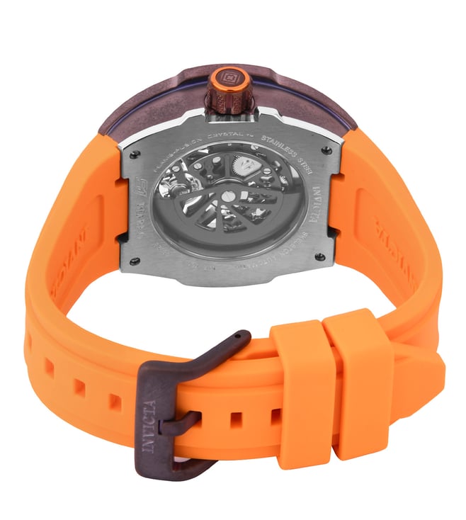 Add a stylish dimension to your look by wearing this men's analog watch from INVICTA. The black tonneau dial is protected by a sapphire glass. Thesilicon strap comes in a orange hue that further elevates the look of the timekeeper. Besides, it is completed with a buckle clasp to ensure a secure fit on the wrist.