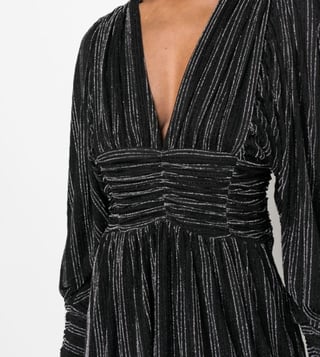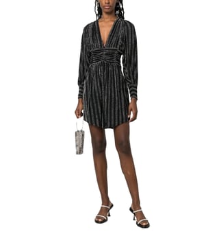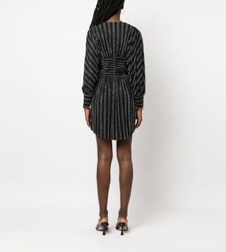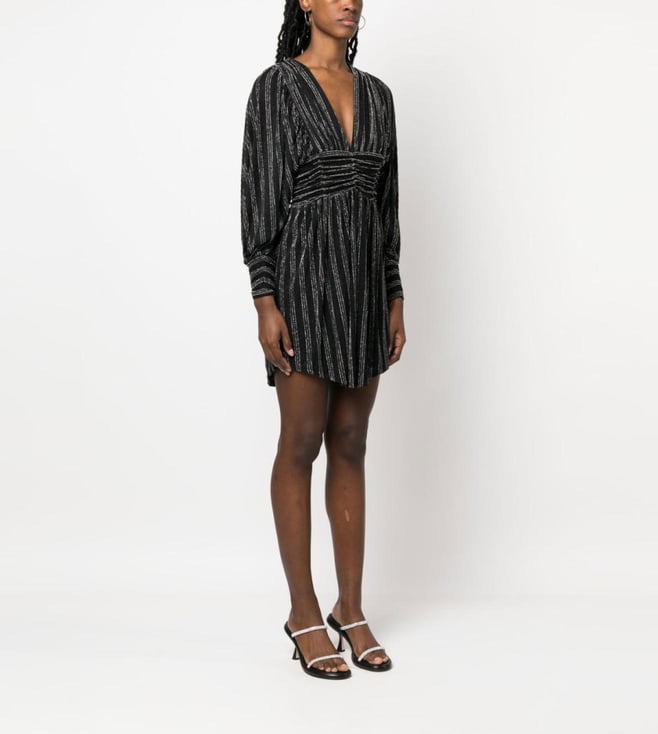 Embrace elegance with this striking black dress, featuring a regular fit that flatters every silhouette. The sophisticated striped pattern adds a touch of modernity, while long sleeves provide a graceful finish. A chic V-neckline enhances its allure, making it perfect for any occasion. Crafted with a luxurious lining of 100% polyester, the outer fabric blends nylon, metallic fiber, and spandex for a hint of shimmer and stretch. Designed for the contemporary woman, this dress is a timeless addition to any wardrobe.