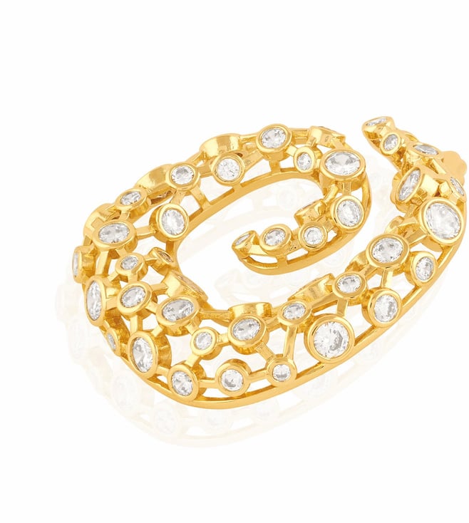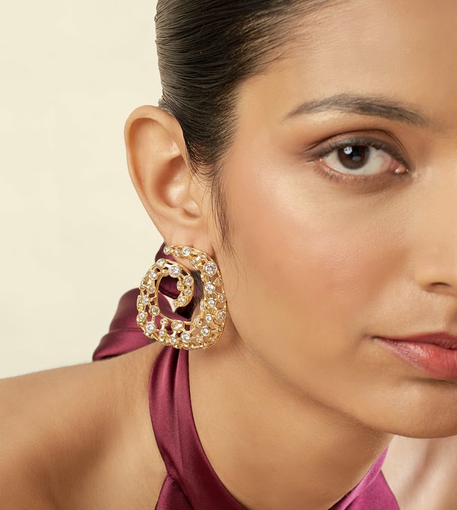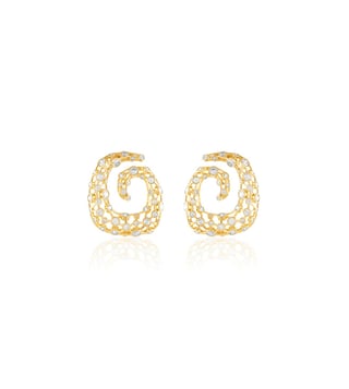 Make a bold statement with gold-and-white studs set with crystal zirconia. Inspired by Portuguese filigree and Isharya¿s signature mirror work, these 18k gold-plated brass stunners are hypoallergenic ¿ perfect for weddings, parties, and every festive affair. Shop now.