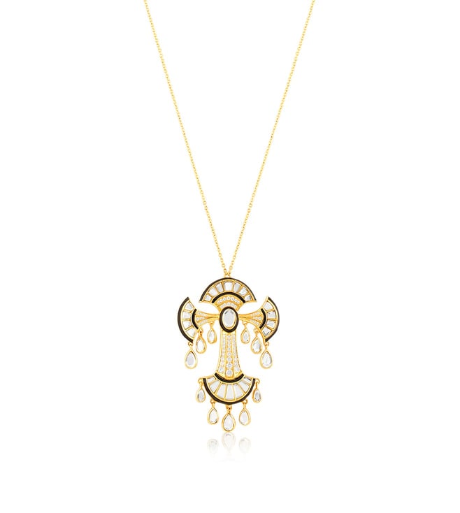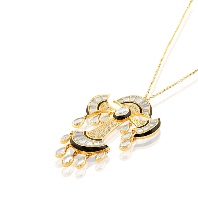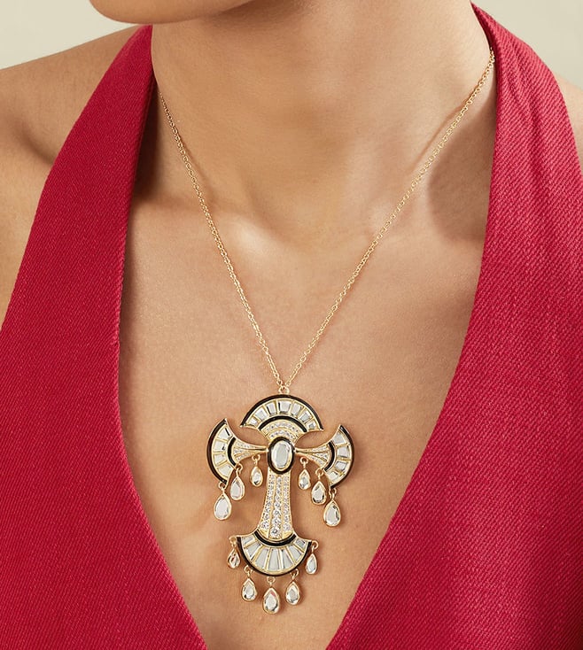 This gold-and-white pendant necklace dazzles with hand-cut mirrors and crystal zirconia, framed in Portuguese-inspired filigree. Crafted in hypoallergenic brass with 18k gold plating, it¿s your go-to for weddings, cocktails, and festive nights. Shop Isharya¿s luxury now.