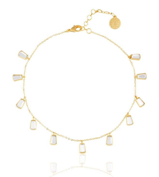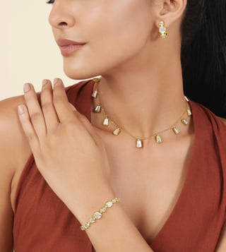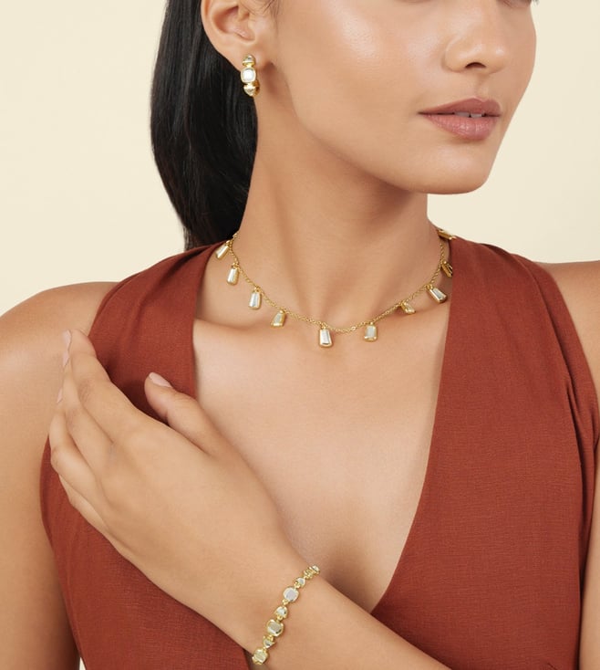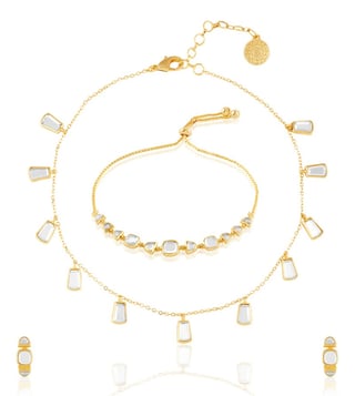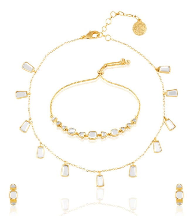 This necklace, bracelet, and earring set features signature hand cut mirrors and stunning 18k gold plating. Crafted in brass and inspired by art deco design, it is the perfect choice for social gatherings, parties, or adding a touch of sophistication to your everyday wear. Pair this set with an elegant evening dress or use it to elevate your daytime look. Shop now and make a statement with Isharya's golden geometry set.