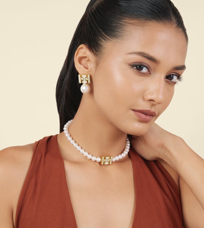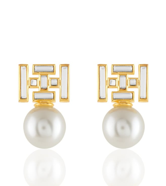 The pearl prism mirror set combines luminous pearls, signature hand cut mirrors, and 18k gold plated brass for a bold yet refined finish. Hypoallergenic and expertly crafted, it is the perfect balance of classic and contemporary. Style it with a cocktail sari or structured dress for effortless party glamour. Shop now to gift standout sophistication.