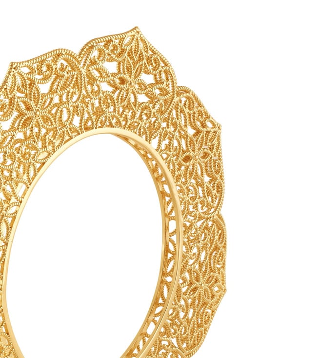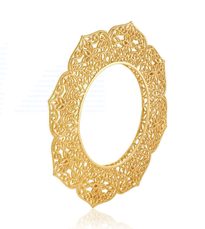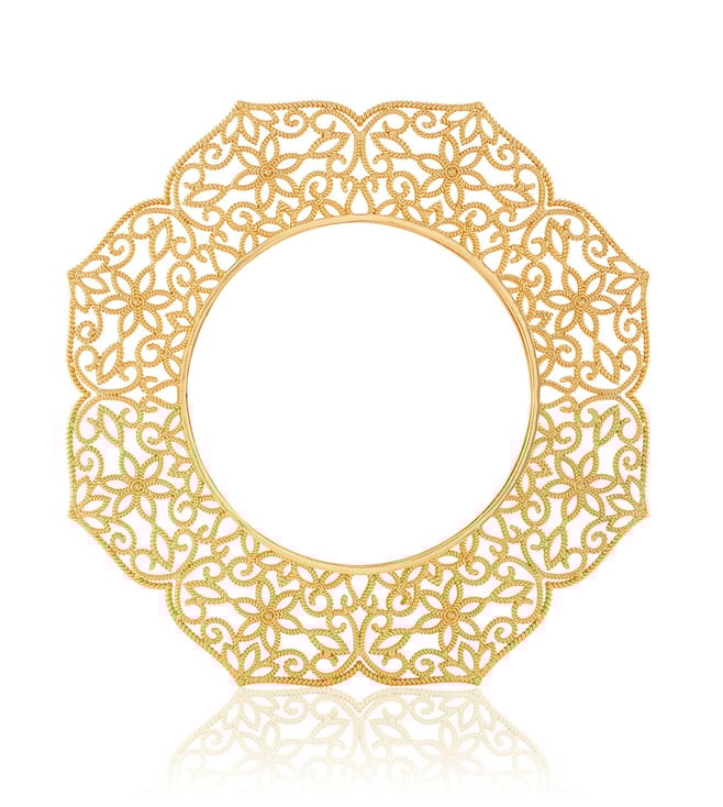 This bold gold-and-white bangle features hand-cut mirrors and intricate Portuguese-inspired filigree with Isharya¿s signature touch. Hypoallergenic and 18k gold-plated, it elevates weddings, parties, and festive looks. Own the spotlight¿shop now.