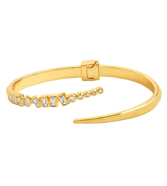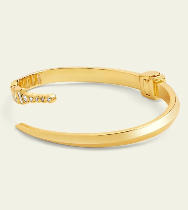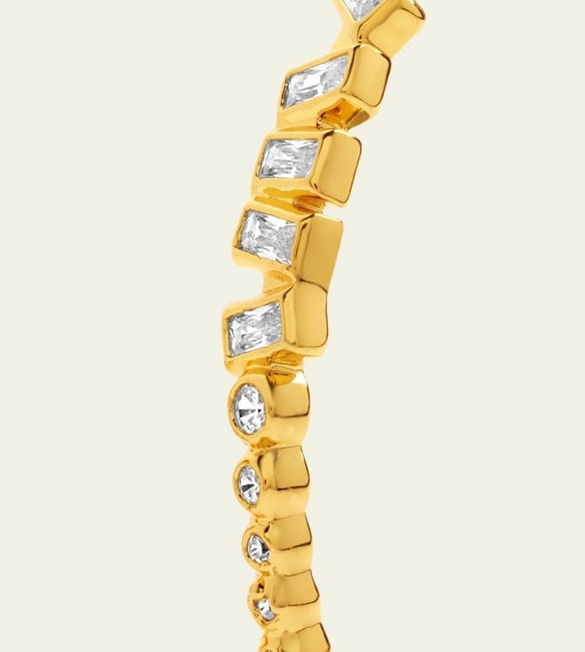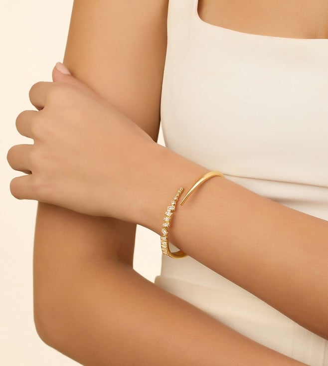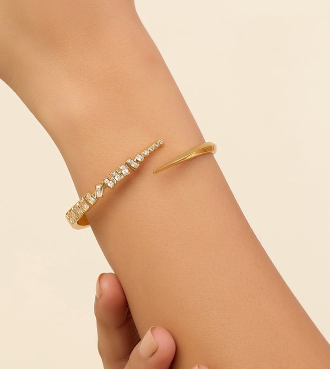 Take your wrist stacking game to the next level with this cuff. It is 18 kt gold-plated and adorned with cubic zirconia. Elevate your style with this luxurious accessory. Disclaimer: Product colour may slightly vary due to photographic lighting sources. Country of Origin - India.