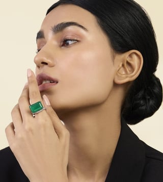 Elevate any outfit with this ring. Featuring a doublet dark emerald, cubic zirconia in a bold cocktail design, this ring is crafted with brass and rhodium plating with E-coating for a luxurious finish. Disclaimer: Product colour may slightly vary due to photographic lighting sources. Country of Origin - India.