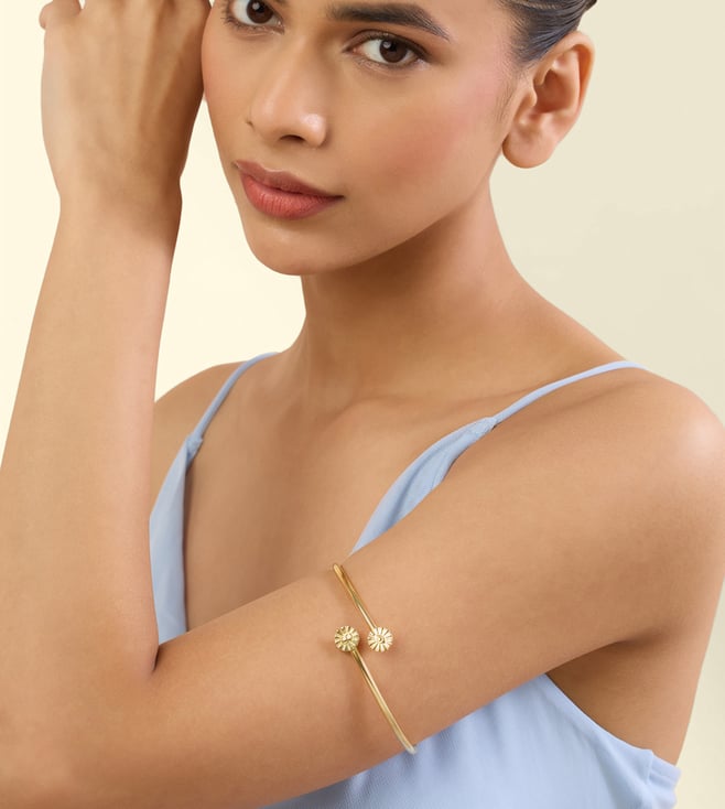 A modern heirloom to treasure. This cuff bracelet, crafted in brass with 18k gold plating, reimagines temple inspired motifs for today. Stack it up or wear solo perfect for weddings, soirees, or festive nights. Shop the sparkle now.
