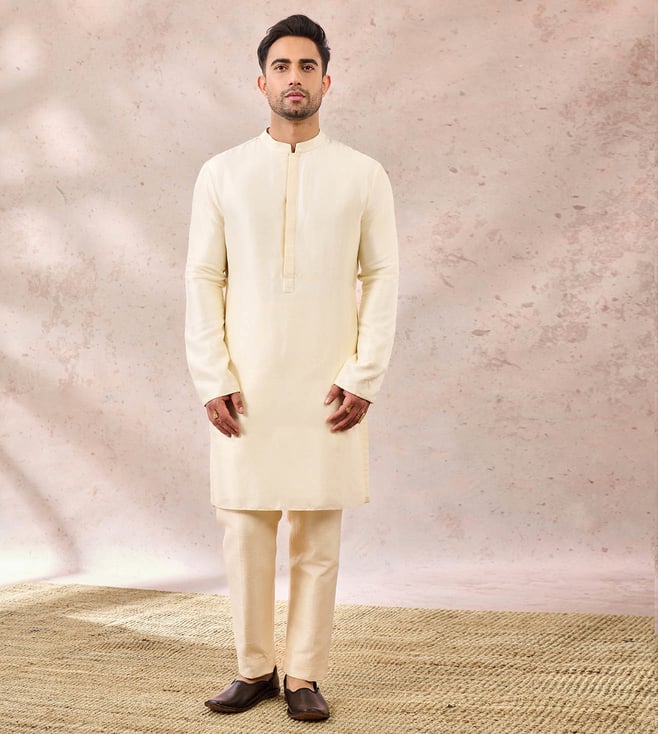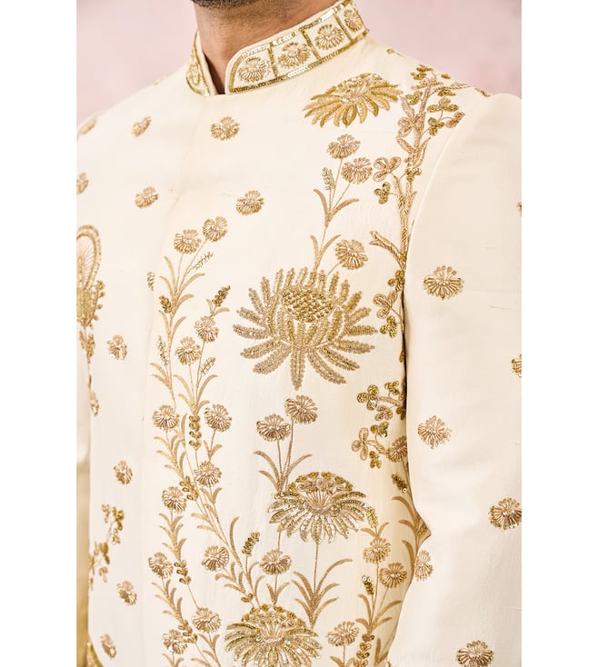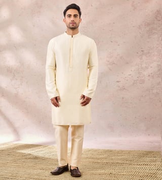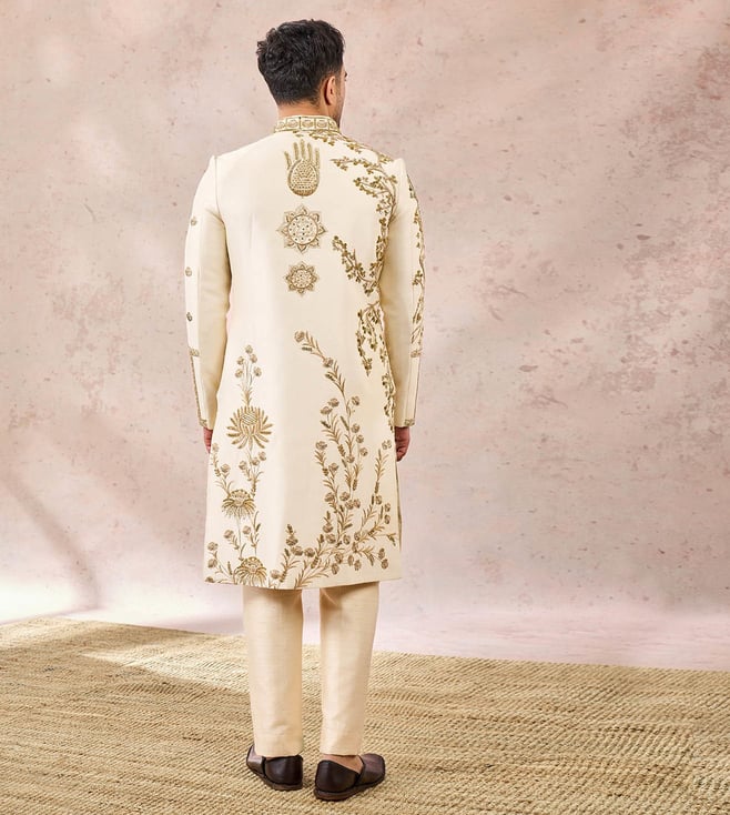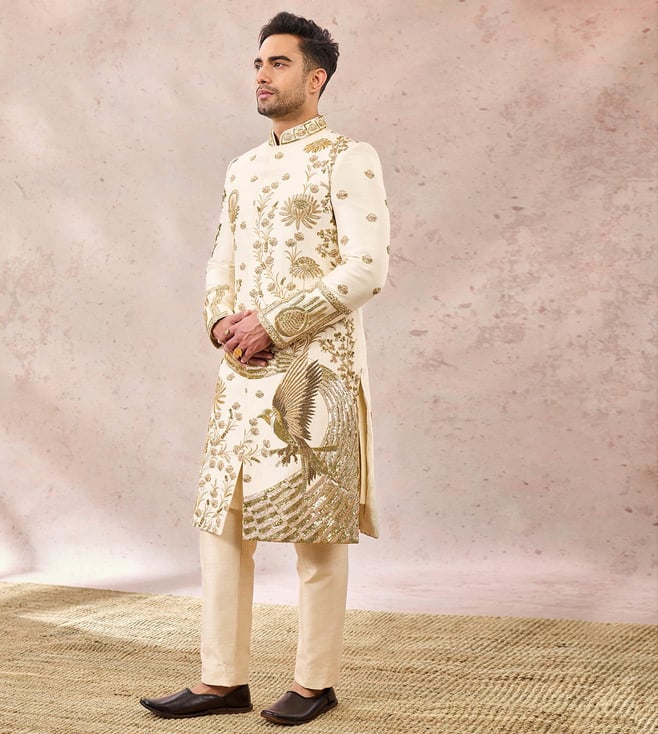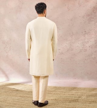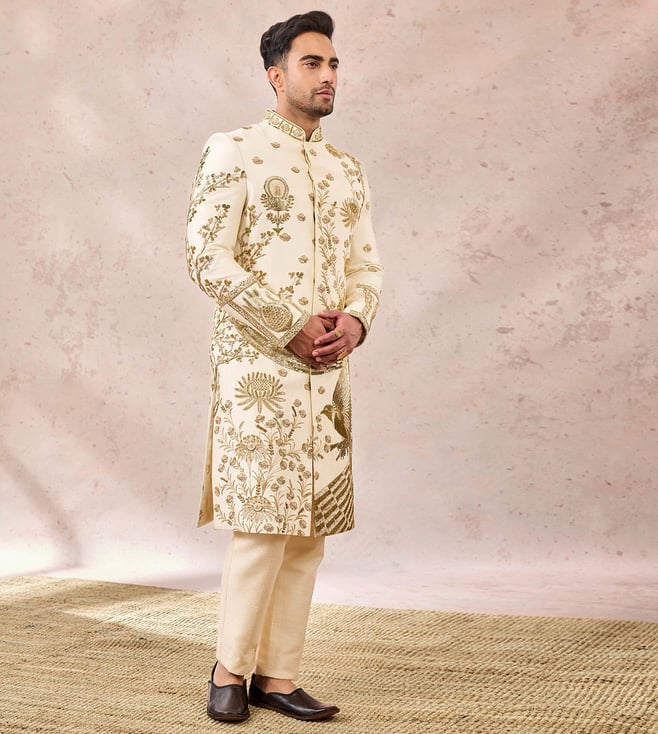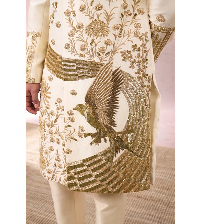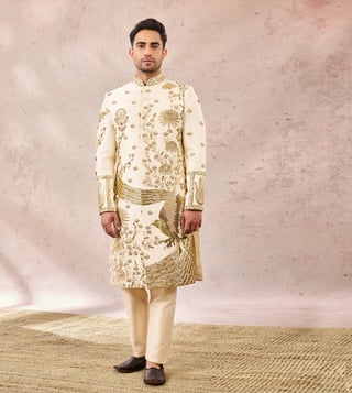 The Ivory Sherwani Set is a regal and refined ensemble featuring intricate embroidery with the Son Chidiya motif, a symbol of grace and freedom, delicately worked into the fabric. The sherwani’s craftsmanship showcases fine detailing, exuding a timeless elegance. It is paired with a classic kurta, providing a traditional yet contemporary look, and tailored pants that offer a sharp, modern silhouette.