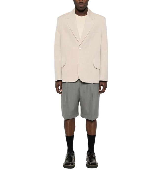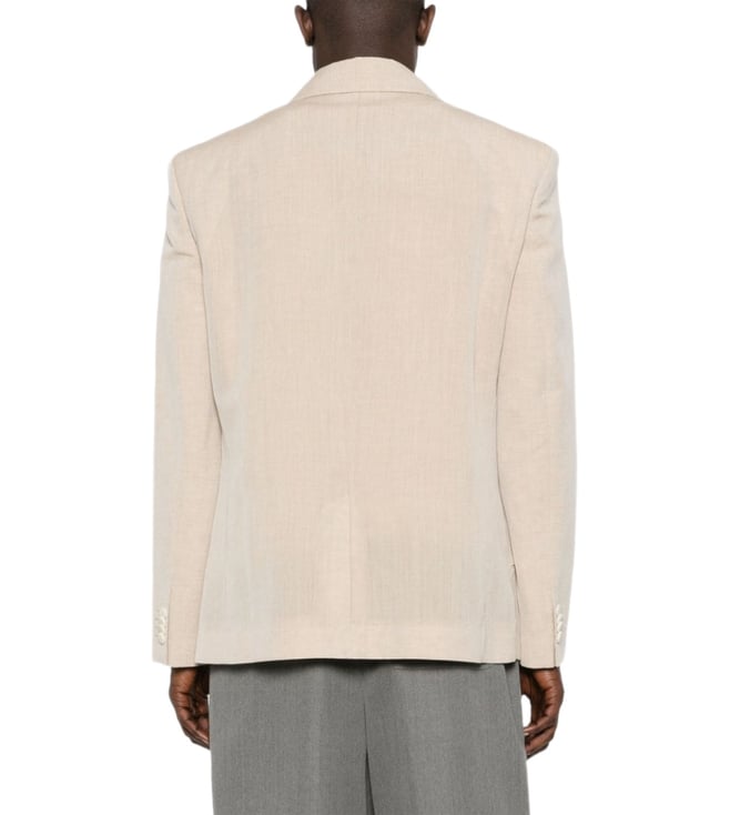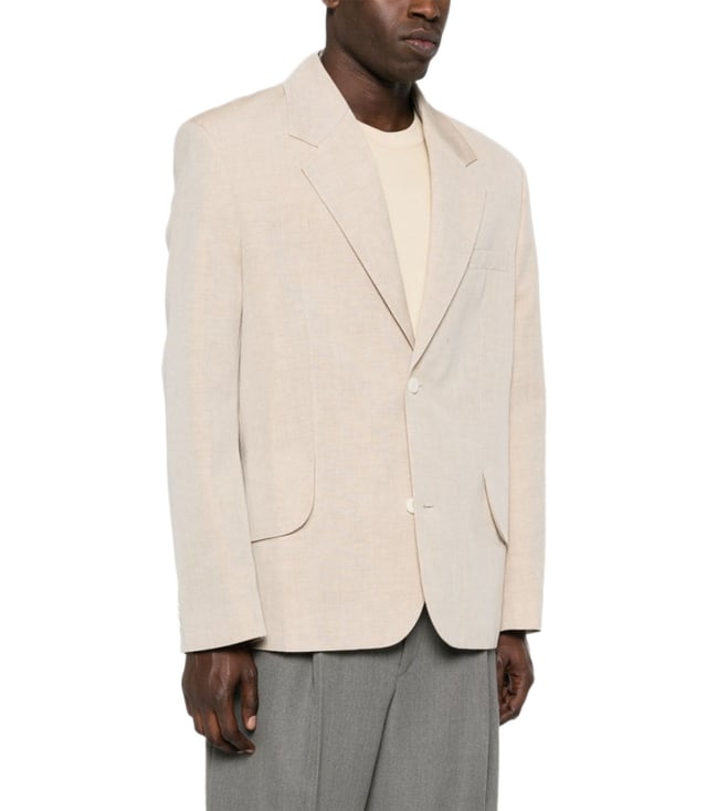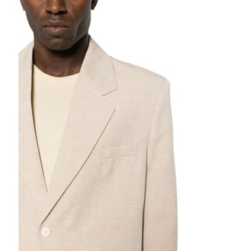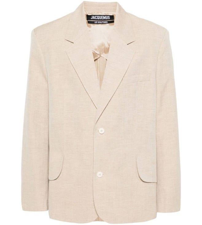 Elevate your style with the Jacquemus Beige Regular Fit Blazer. Notched lapels shoulder pads long sleeves faux buttonedcuff sleeves chest welt pocket two front flap pockets central rear vent internal slip pockets partial lining front button fastening composition: lining: viscose outer: linen/flax 57%, wool 43% this piece fits true to size. recommend you get your regular size model is 1,84m / 6ft 1in wearing size 48 (it).